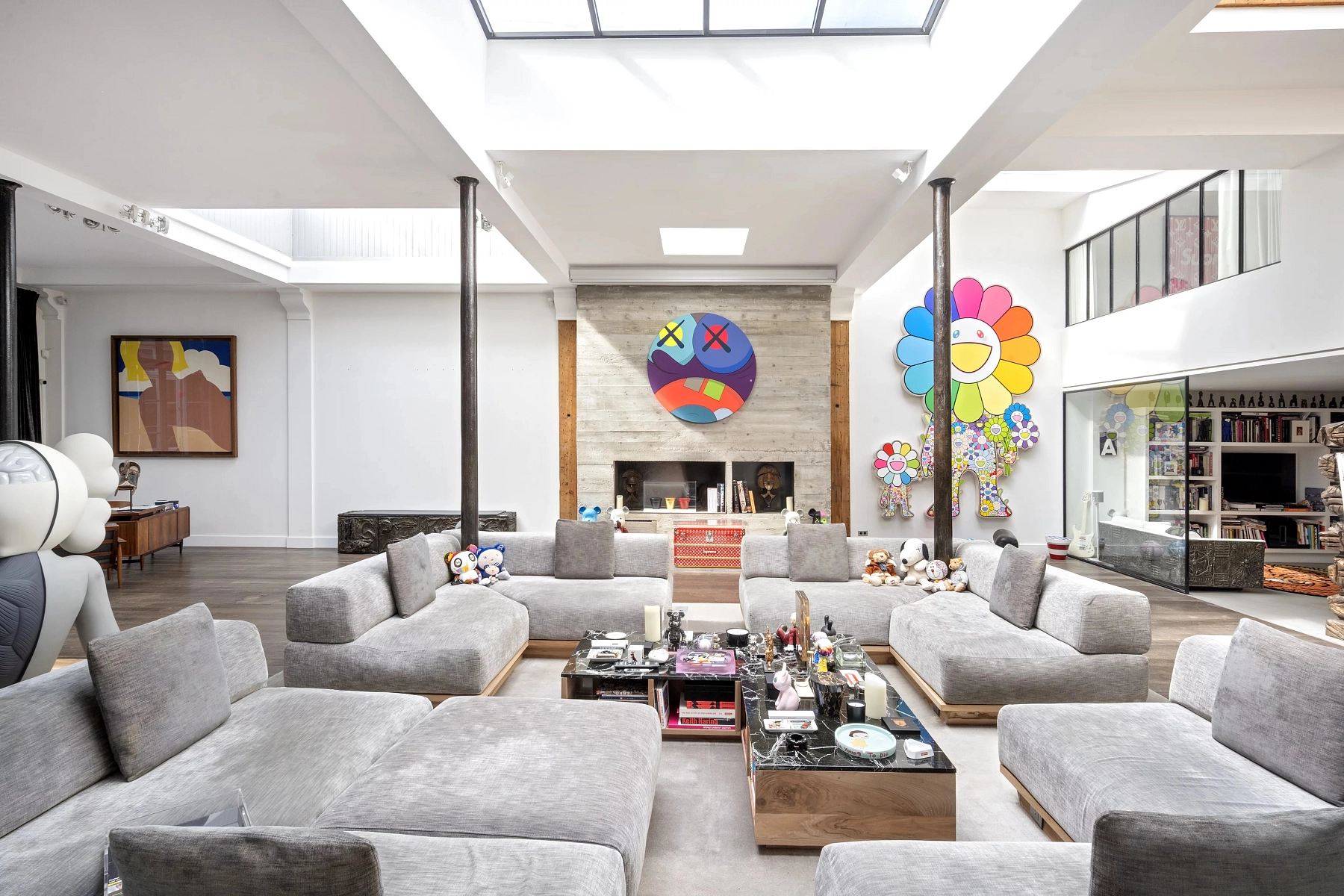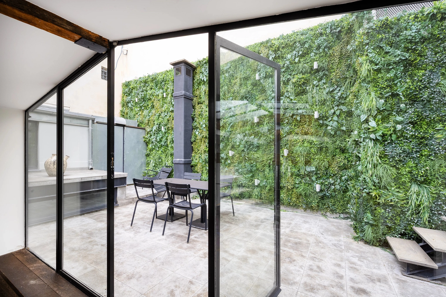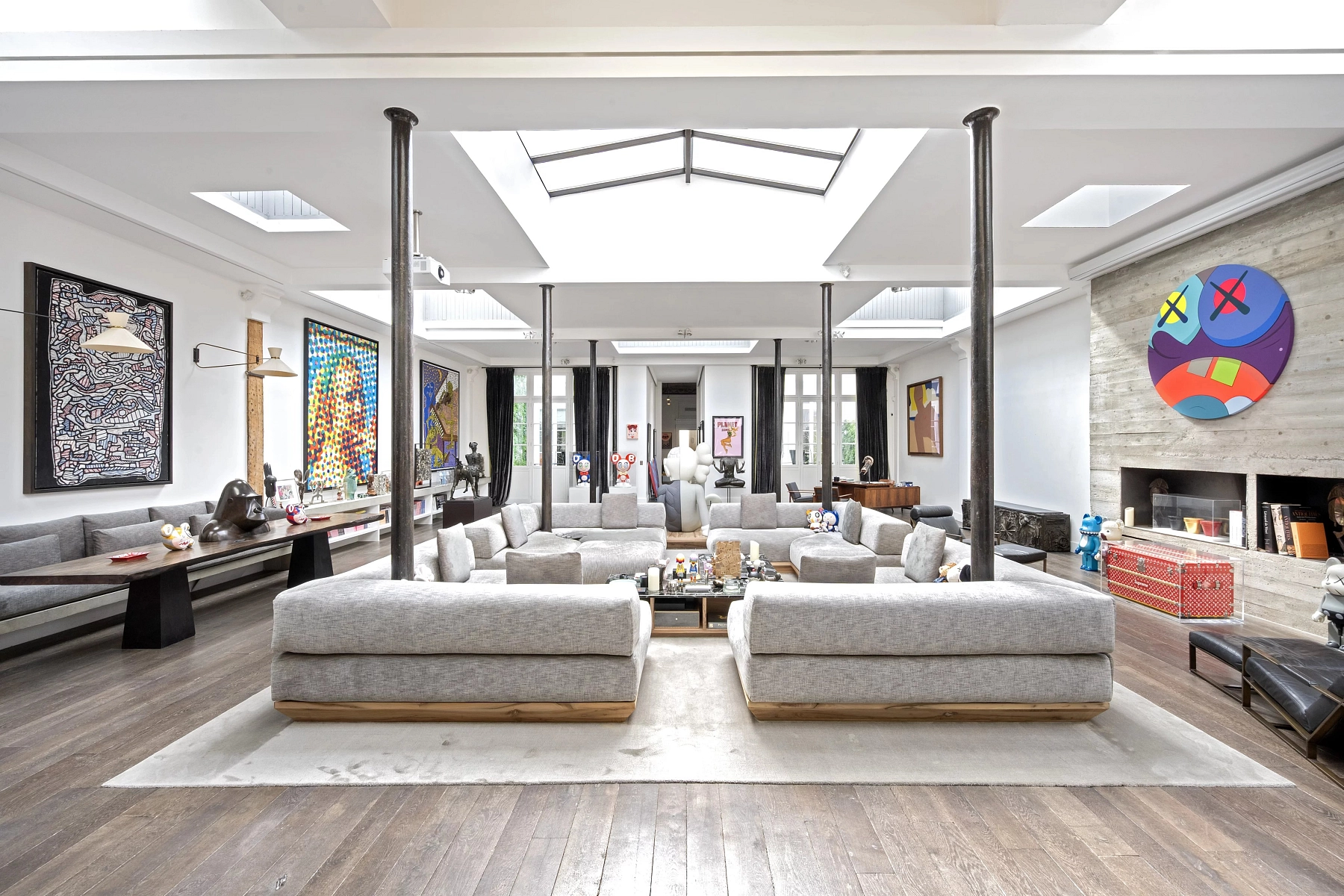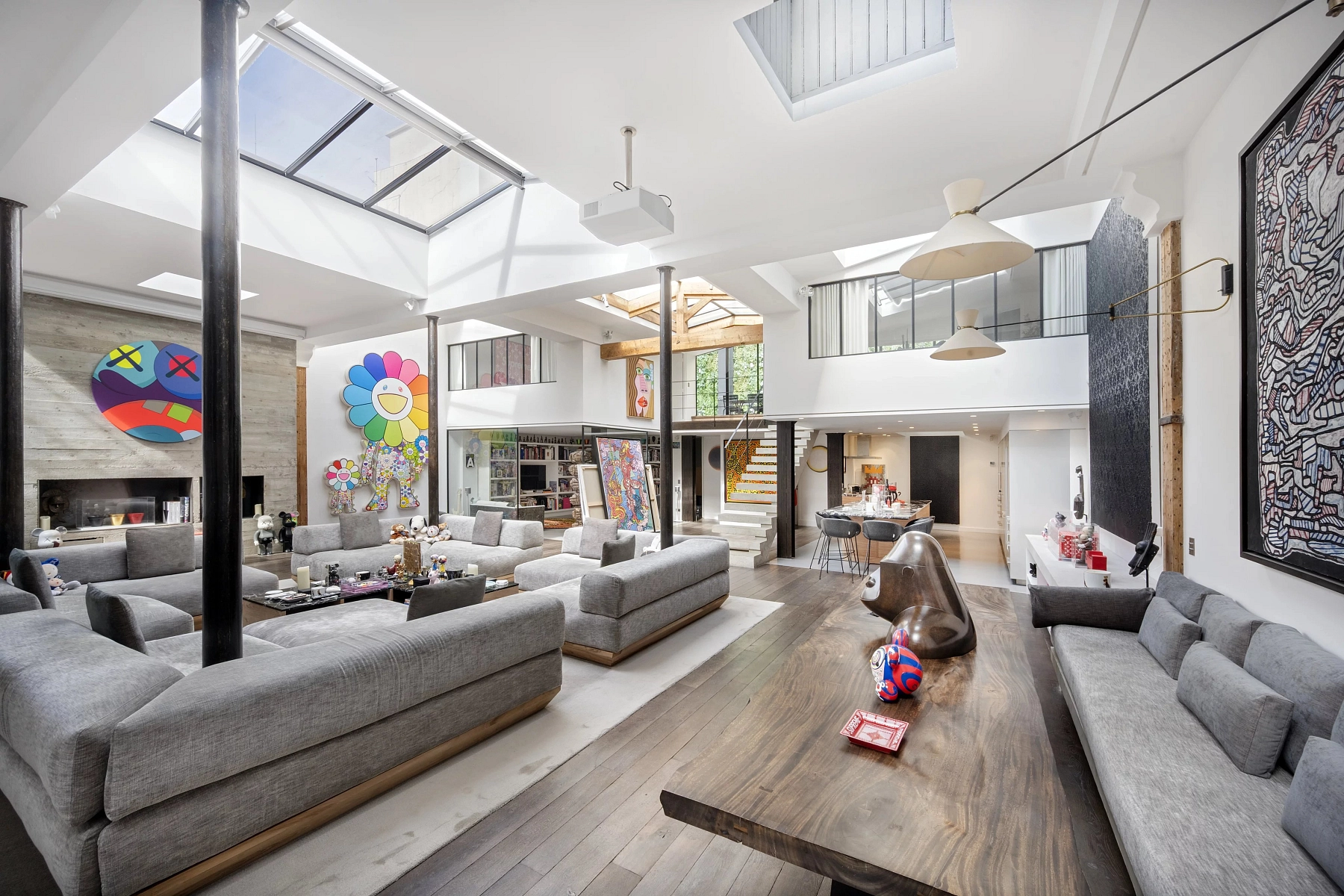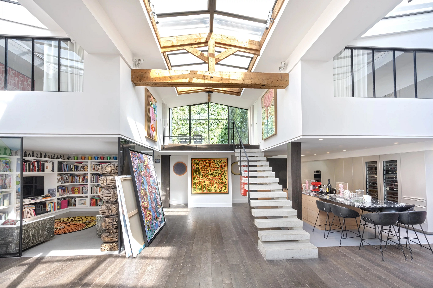 The first part, measuring 125 m² and typical of the building’s period, features 4.5-meter-high ceilings, Versailles-pattern parquet flooring, and beautiful painted ceilings that are protected as historical heritage. The remaining 335 m² of living space has a distinctly contemporary character, with ceilings 5.3 meters high and a partially glazed roof. The equipment includes air conditioning, a fireplace, security system, access code, double glazing, and electric awnings.