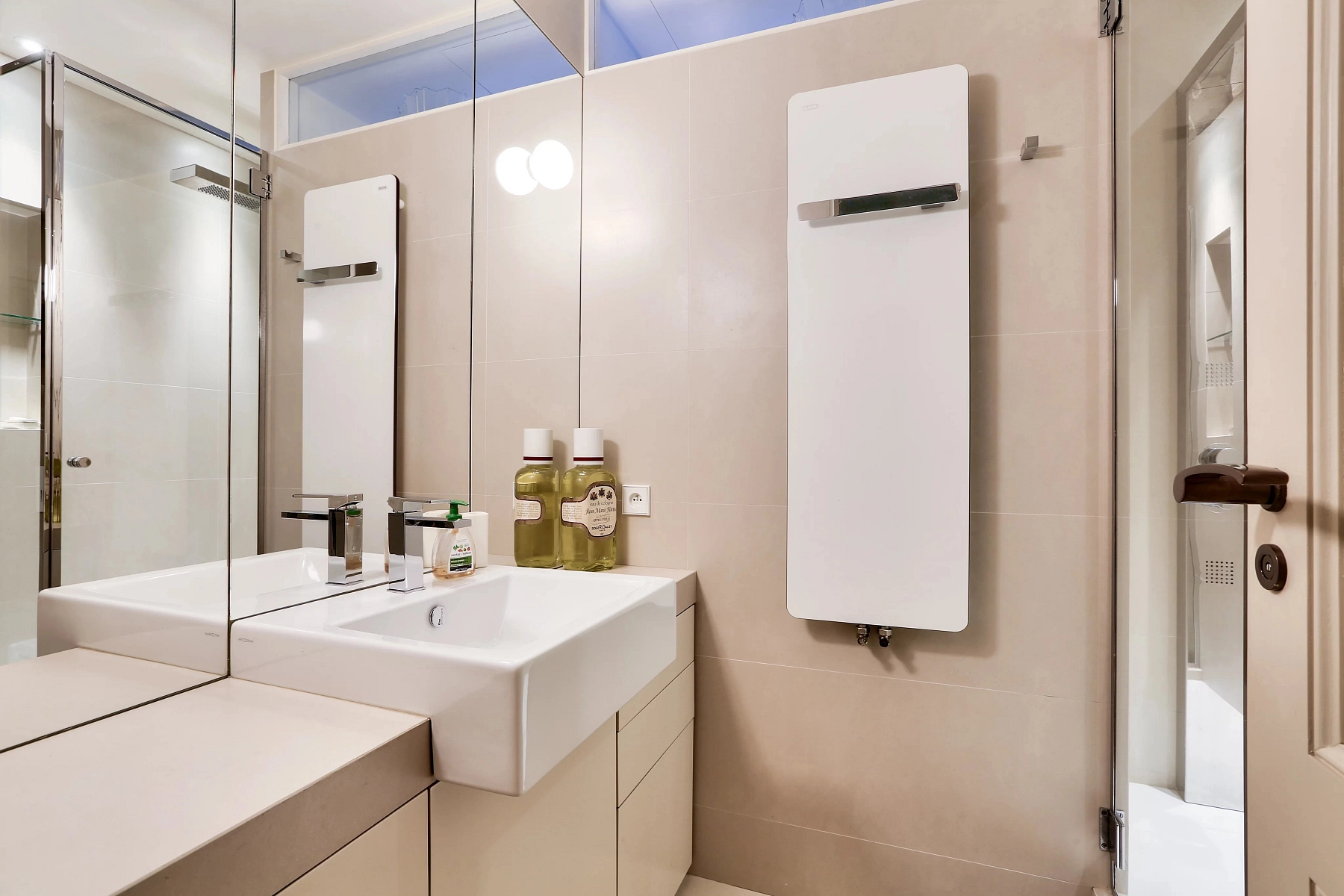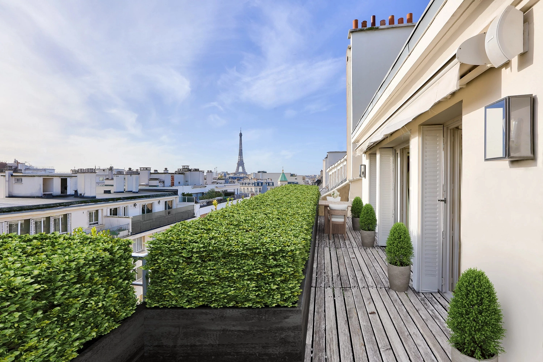 The apartment, spread across the 7th and 8th floors of the building, offers a spacious glass-walled, studio-style living room with a ceiling height of 5.7 meters, opening onto a 27 m² terrace. There is also a large dining room, a kitchen, and three bedrooms with full bathrooms or showers. The upper floor, which features an 84 m² terrace, includes a lounge, a study, and a fitness room with a shower. Another terrace of 45 m² provides panoramic views of Paris.