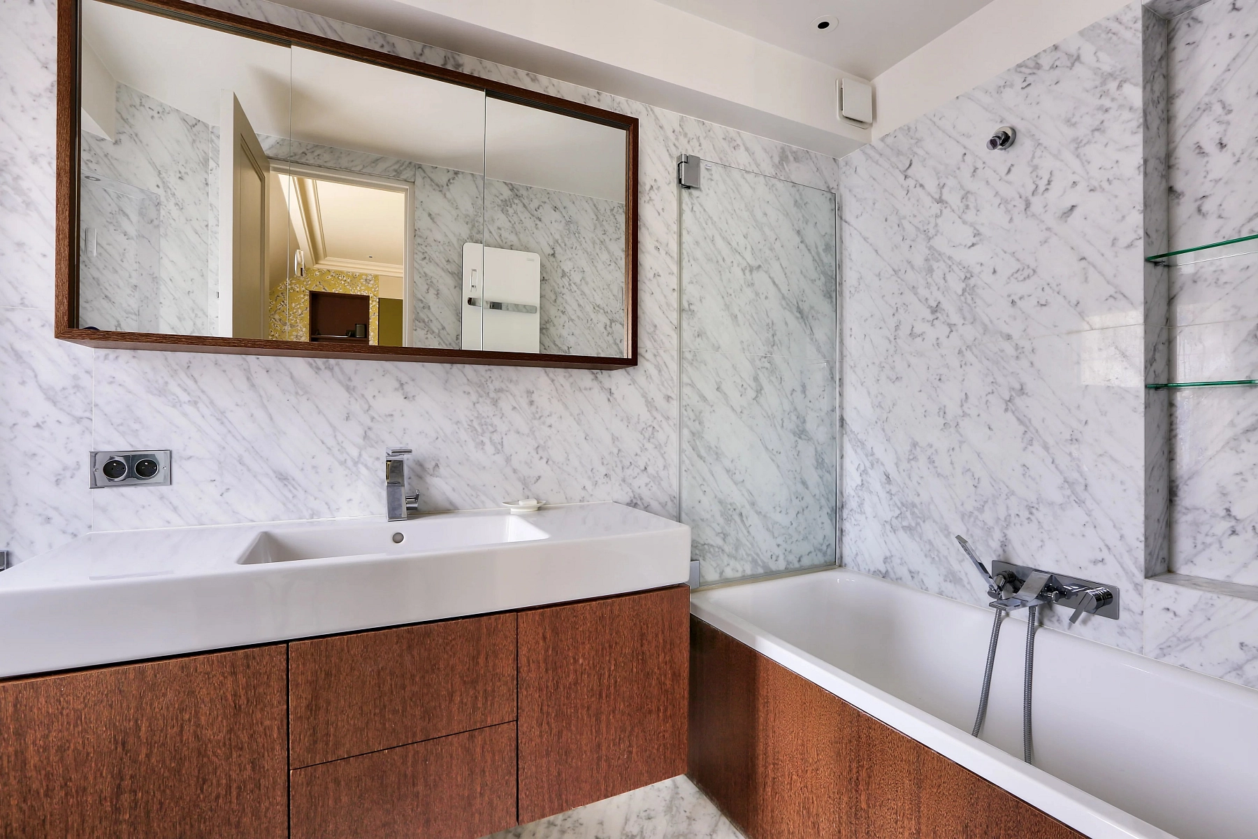 The entire apartment is fully air-conditioned, and its amenities include a fireplace, double-glazed windows with electric shutters, secure entrance doors, a videophone, an alarm system, and keypad access. The building has an elevator, concierge service, and—at an additional cost—two parking spaces. The garage is equipped with an electric vehicle charging station.