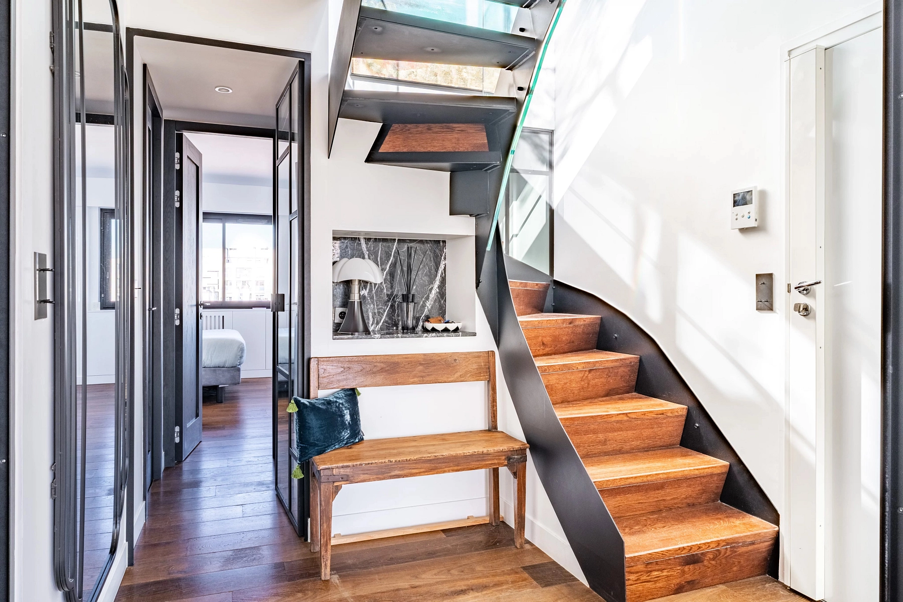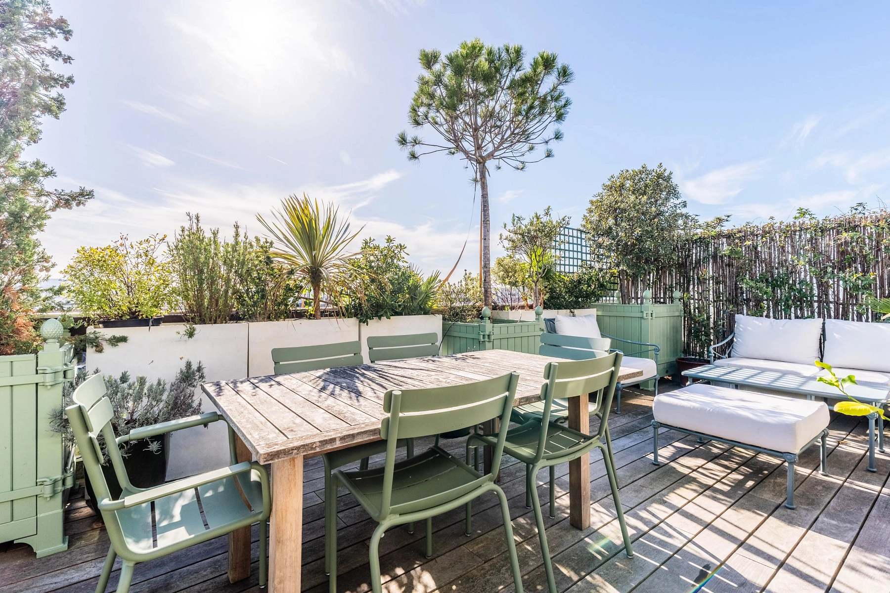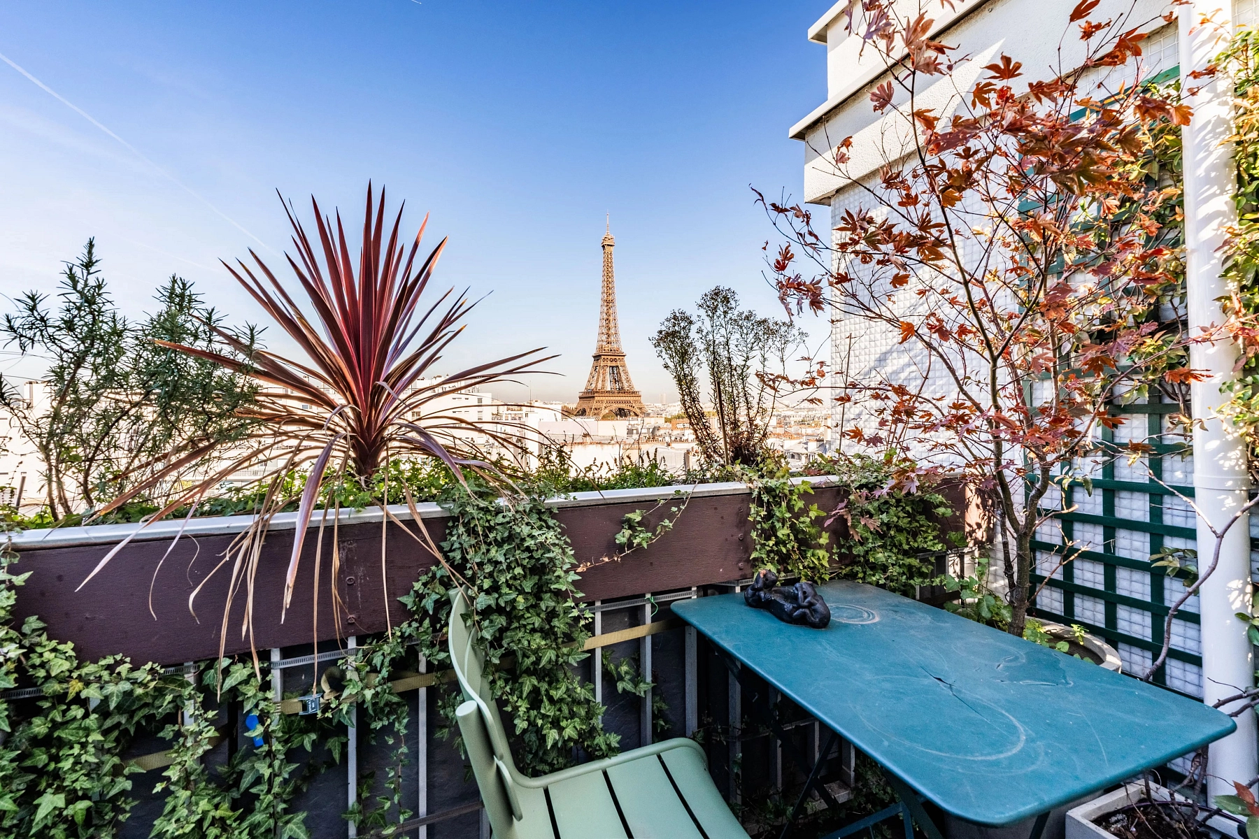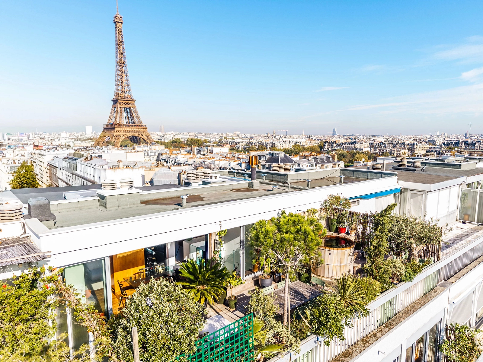 A unique offer for an air-conditioned duplex apartment with terraces, a balcony, and breathtaking views. This spacious apartment is located on the top floors of an elegant 1920s building on the edge of Paris’s most prestigious district, home to the Eiffel Tower.