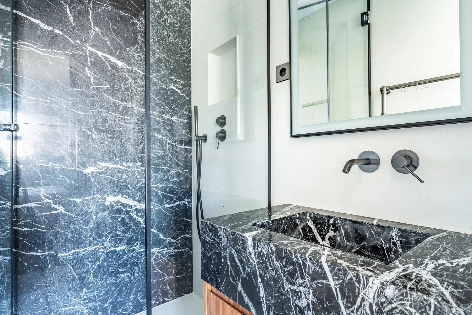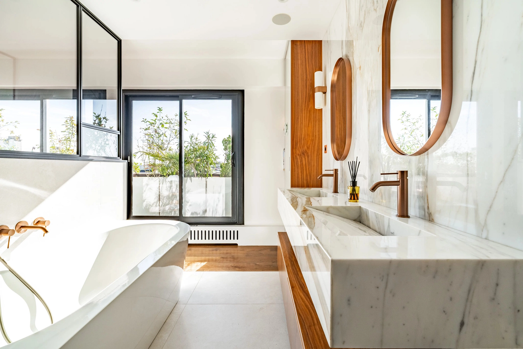 The apartment, spread over two levels, offers a spacious living room, a dining room with a fireplace, a kitchen suitable for both indoor and outdoor dining, and an entrance hall. The master bedroom, like the other three bedrooms, has its own bathroom with a WC, ensuring maximum comfort for family and guests. There is also a separate toilet and a utility room. The living space is complemented by two terraces and a balcony, providing pleasant outdoor areas and panoramic views of the Eiffel Tower and other famous landmarks.