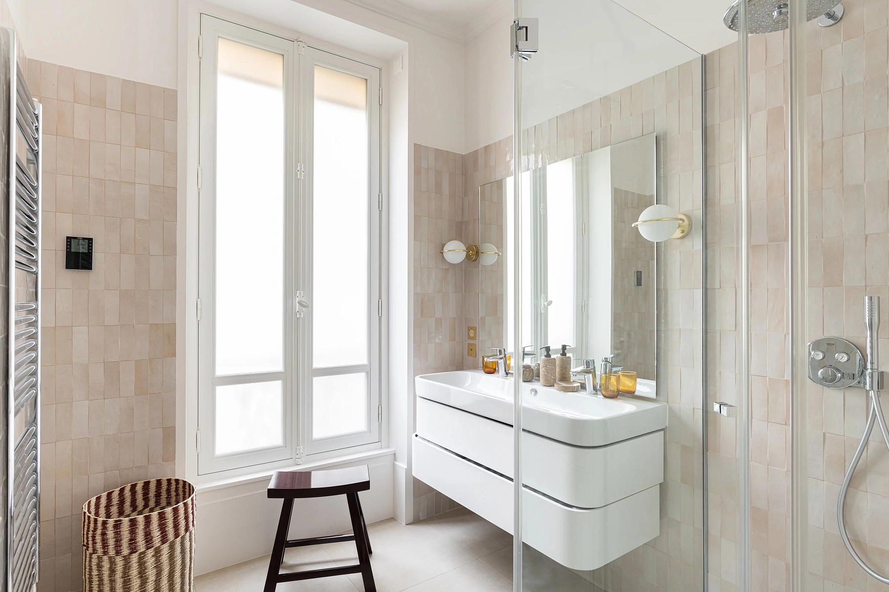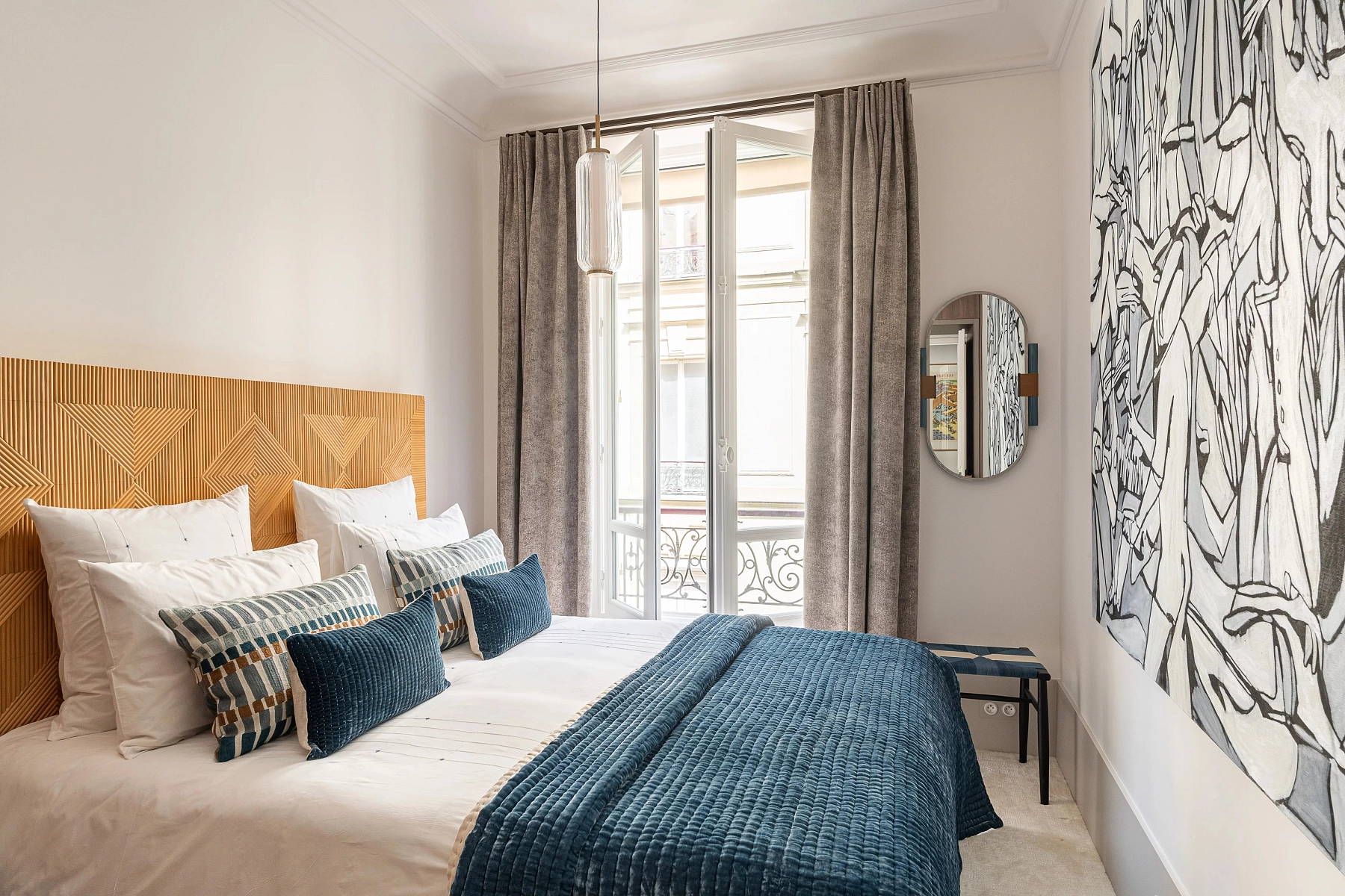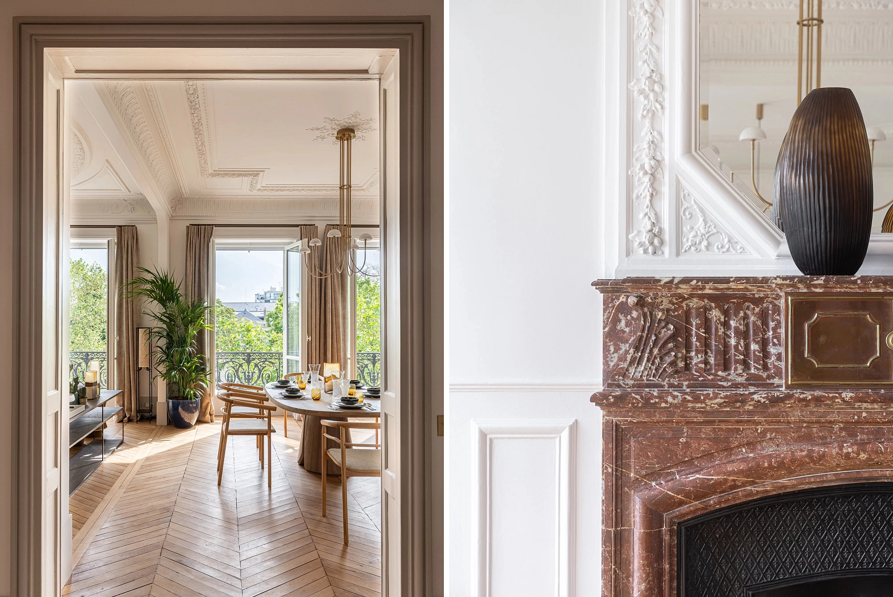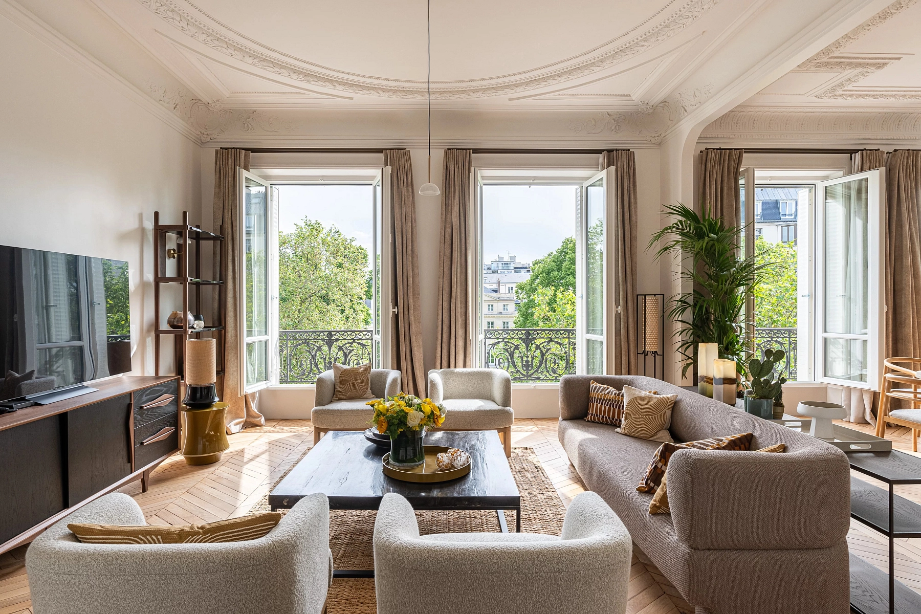 The apartment features ceilings 3.37 meters high, adorned with elaborate decorative details, and offers plenty of storage space. The unit is sold fully renovated and furnished.