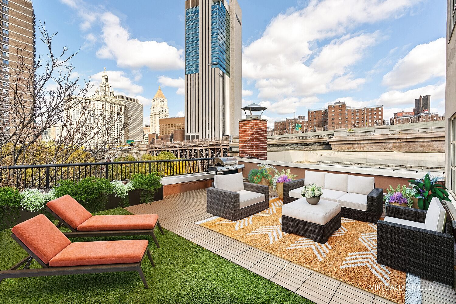 The central space is occupied by a spacious, sun-filled living room with a premium Viking kitchen. An elegant spiral staircase leads to the master bedroom, which opens through French doors onto a large private terrace with unobstructed views of the Brooklyn Bridge, the Frank Gehry skyscraper, and the World Trade Center. The interior includes two spacious bathrooms, one with a shower and the other with a bathtub.