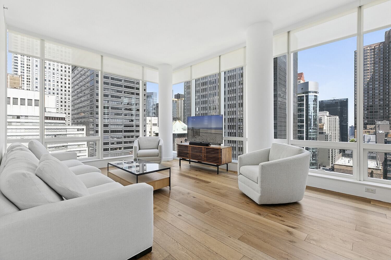 A sun-filled modern apartment with two bedrooms, two bathrooms, and views of Manhattan’s iconic landmarks, including the Chrysler Building, is located on the 22nd floor of the elegant residential complex 325 Lexington Avenue in the prestigious Midtown East.