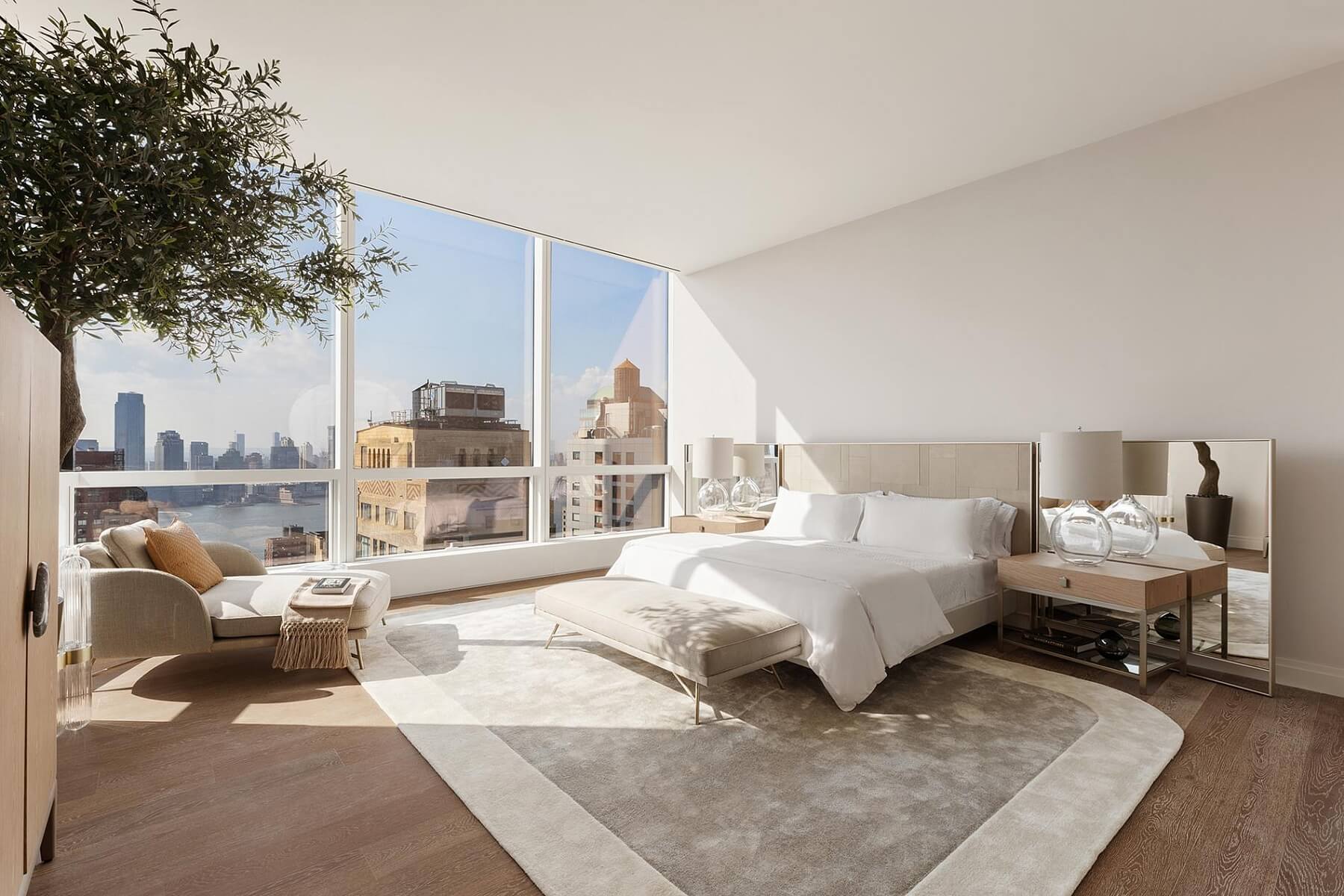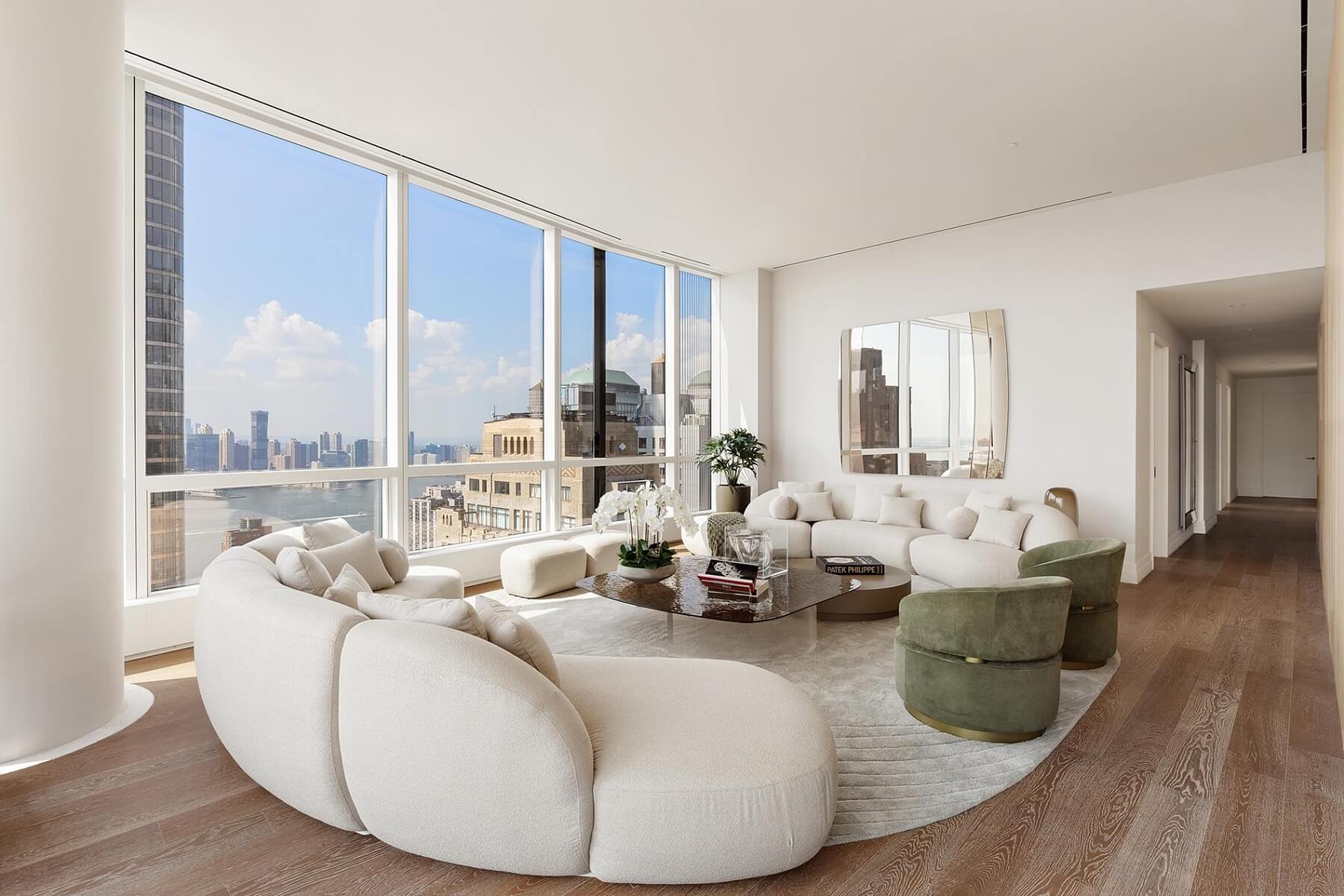 Floor-to-ceiling glass walls flood the interior with natural light and frame breathtaking panoramic views, while the magnificent 3.6-meter ceilings enhance the sense of openness. The environmentally certified residence, with its shimmering glass façade, rises 150 meters above Manhattan. Residents enjoy access to an exclusive top-floor club with 360-degree views, a fireplace, fitness center, private dining room, and children’s playroom, as well as a Zen garden and a dog run on the 12th floor.