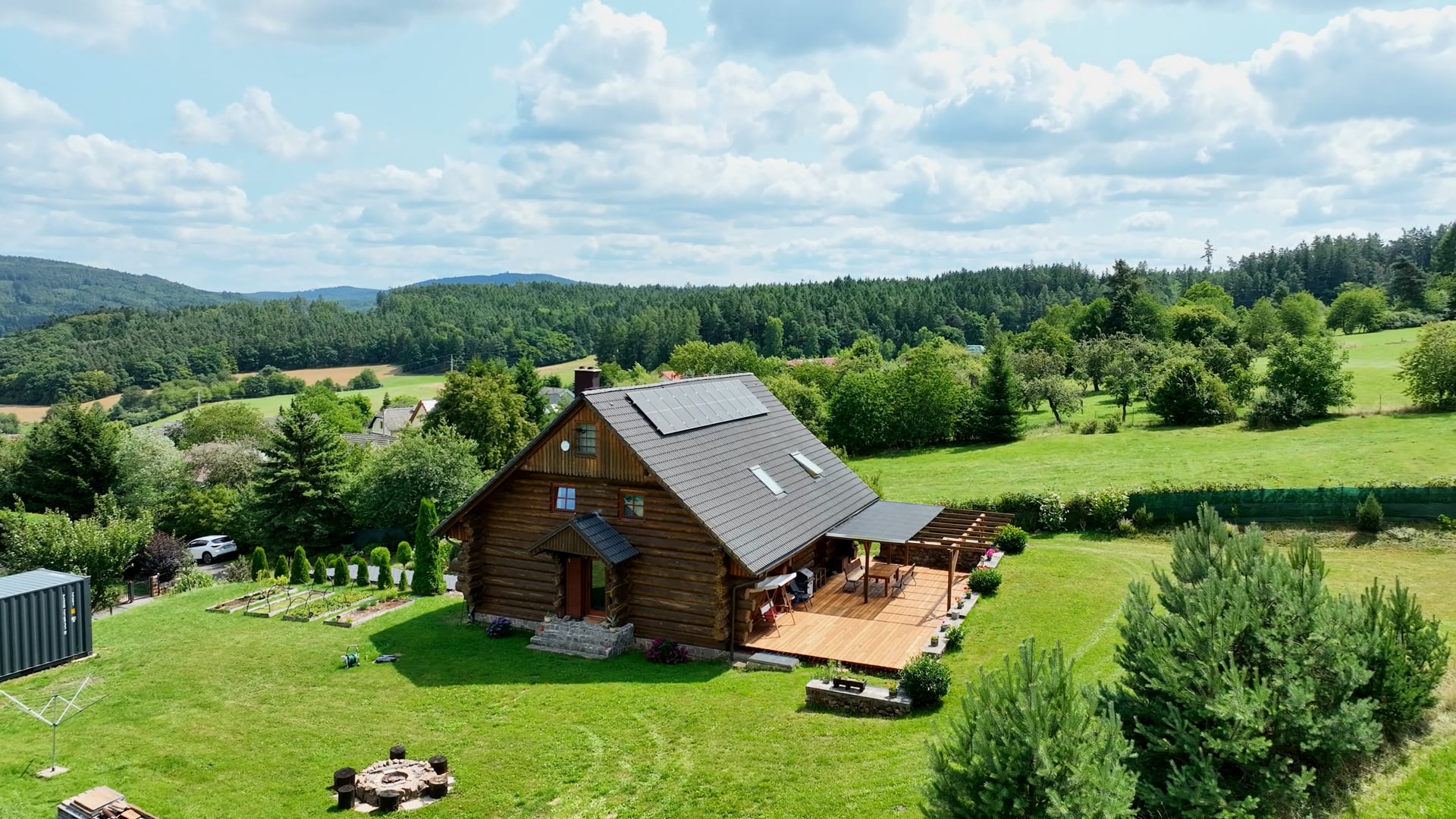 This cozy timber house inspired by traditional log cabins stands on an impressive 11,938 m² plot, offering complete peace and unobstructed views of the surrounding meadows and forests. Located at the very end of the village of Křešín near Hořovice, it allows for daily commuting to Příbram or via the D4 and D5 highways to Prague.