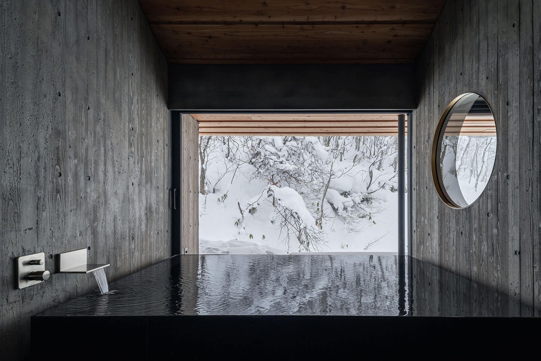 The main part of the residence consists of a three-story building. The ground floor includes a stylish sauna, toilet, changing room with laundry area, and a private garage. The first floor offers four bedrooms, including two master suites with en-suite bathrooms, as well as a social lounge area. On the top level, an airy living room seamlessly connects to a designer kitchen and dining area with floor-to-ceiling glazing. From the balcony, there is a panoramic view of the snow-covered landscape and the village of Hirafu, whose lights create a charming and warm evening atmosphere. Complementing the main residence is a separate wellness building. The ground floor comprises a cozy lounge with a double-sided fireplace, a tatami-style yoga room, men’s and women’s gyms, and a Japanese ofuro bath that embodies a deep, meditative spirit. The basement features a kitchenette, cinema room, a dedicated weightlifting gym, and ample storage space.
