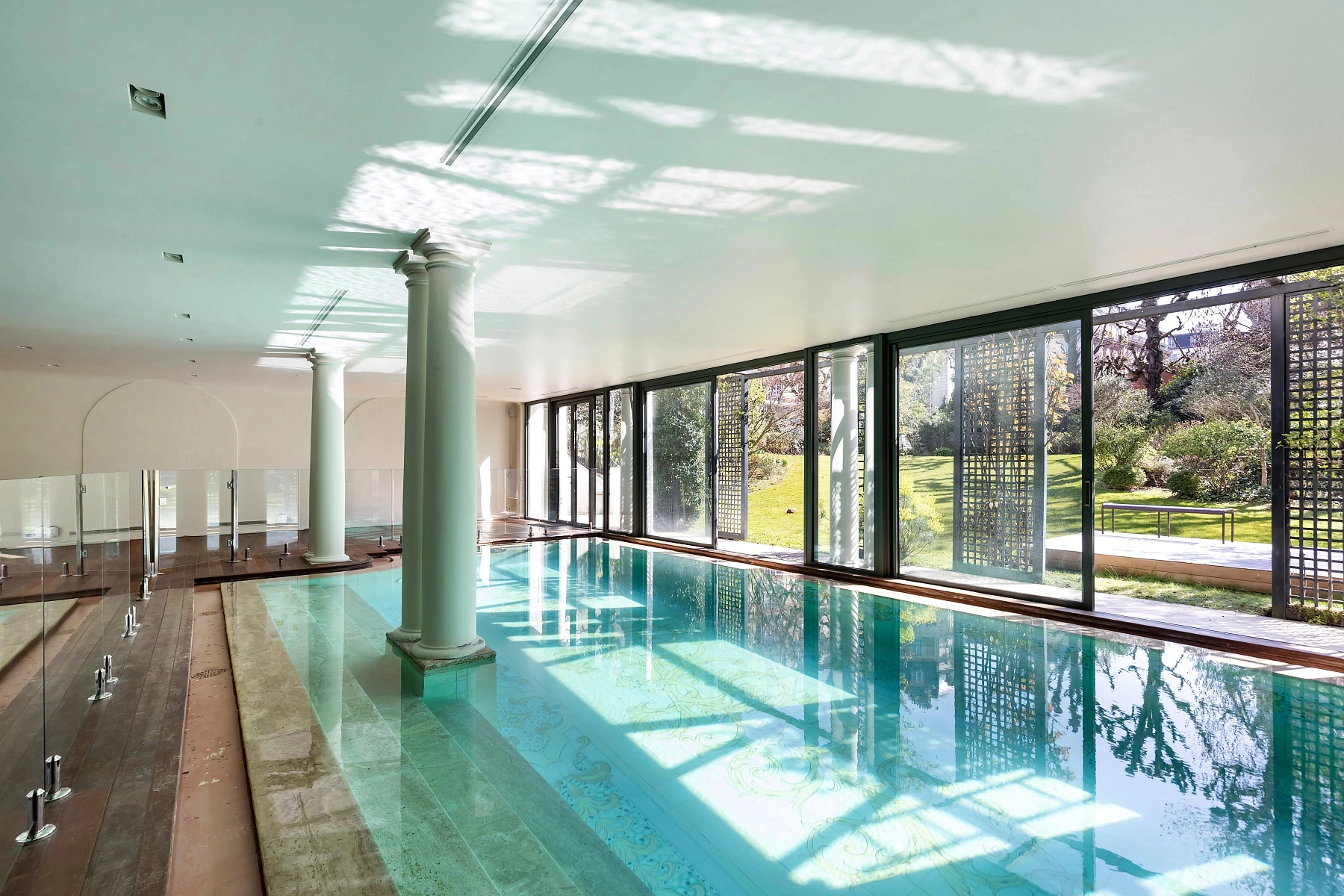 At garden level, extensive leisure facilities are provided, including a 6 × 10 meter swimming pool, a fitness area, a sauna, and a Turkish bath, complemented by changing rooms, a wine cellar, and technical rooms. The home cinema is cleverly designed to also serve as a squash court. In the annex (120 m²) there are four lockable garages and a separate three-room apartment intended for the caretaker. Up to 10 cars can be parked under the outdoor shelter.