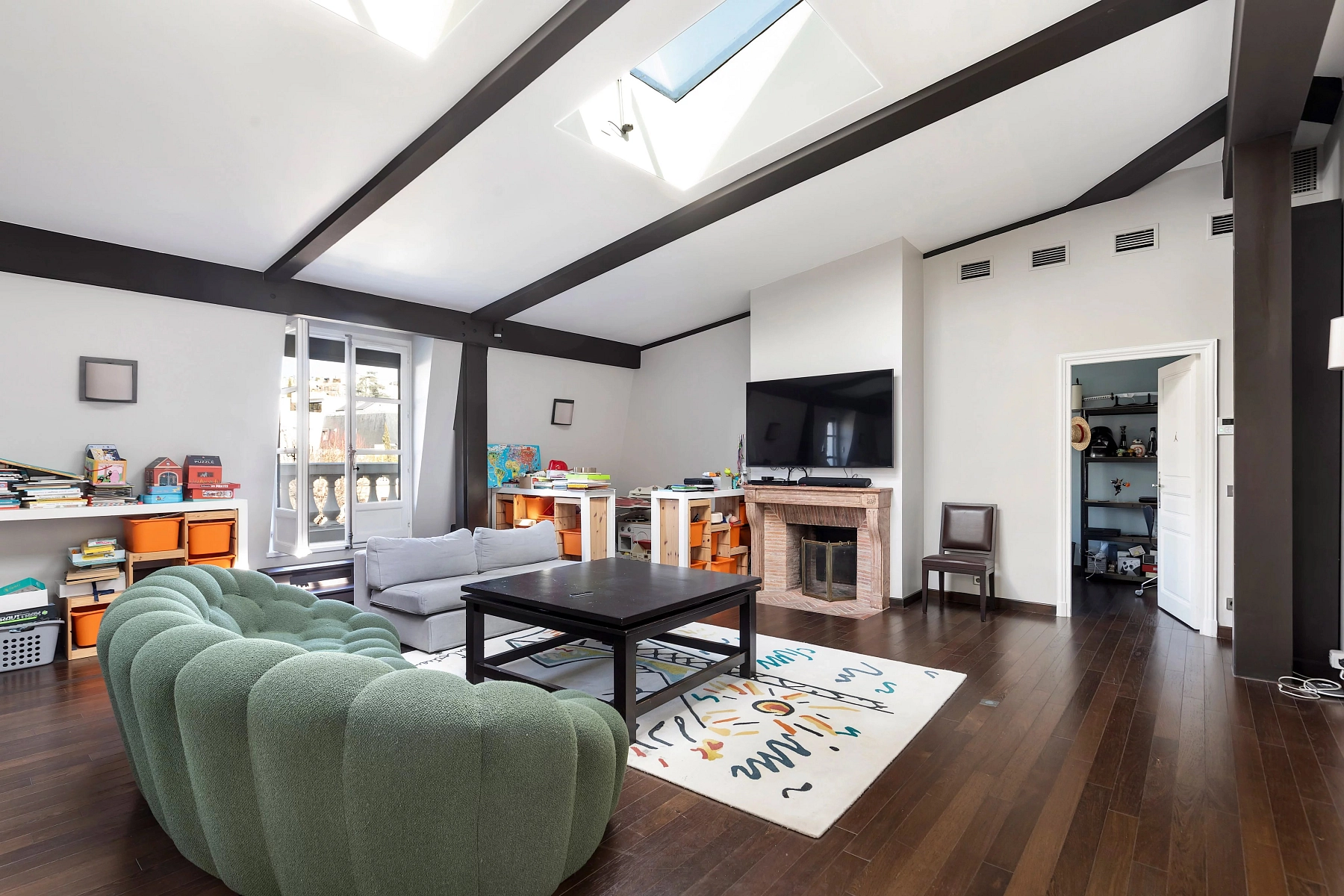 An impressive entrance hall with marble flooring and a monumental staircase with wrought-iron railings leads to a spacious living room with a fireplace and direct access to the terrace, as well as to two studies, a dining room, a fully equipped kitchen with a breakfast nook, and a separate guest toilet. On the upper floor, two apartments are accessible from the landing, with the main apartment occupying nearly 90 m² and featuring direct access to the terrace. The top floor houses a lounge and three additional apartments with balconies and terraces. All floors are connected by an elevator.