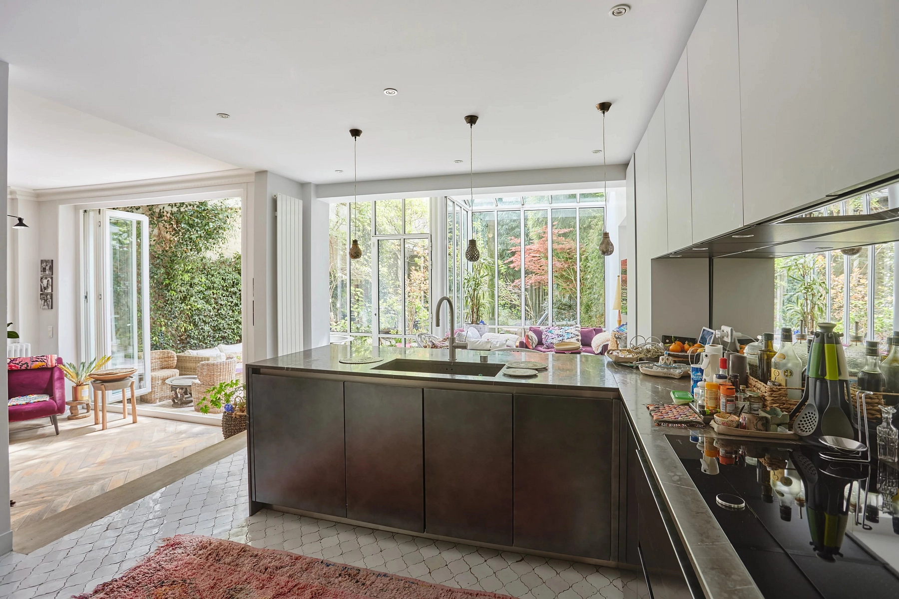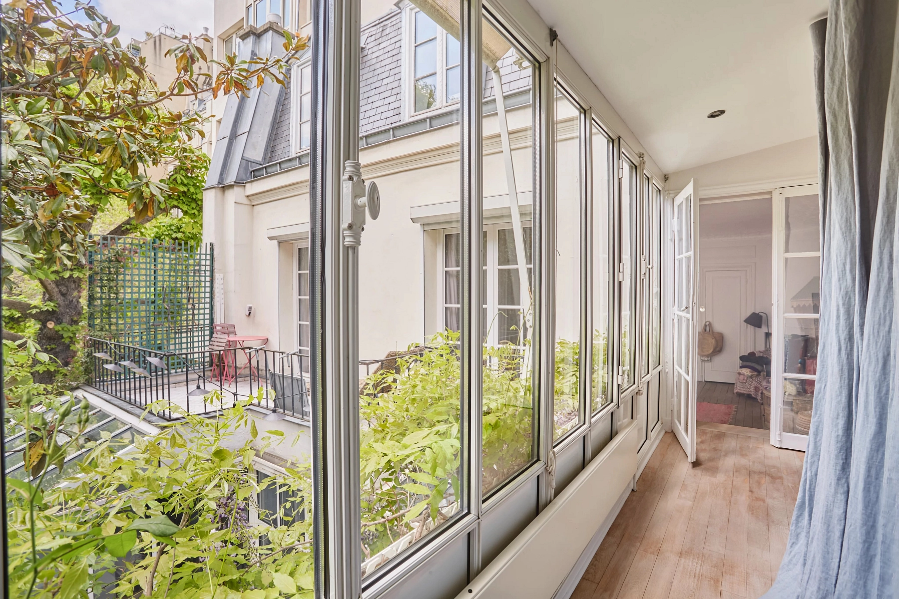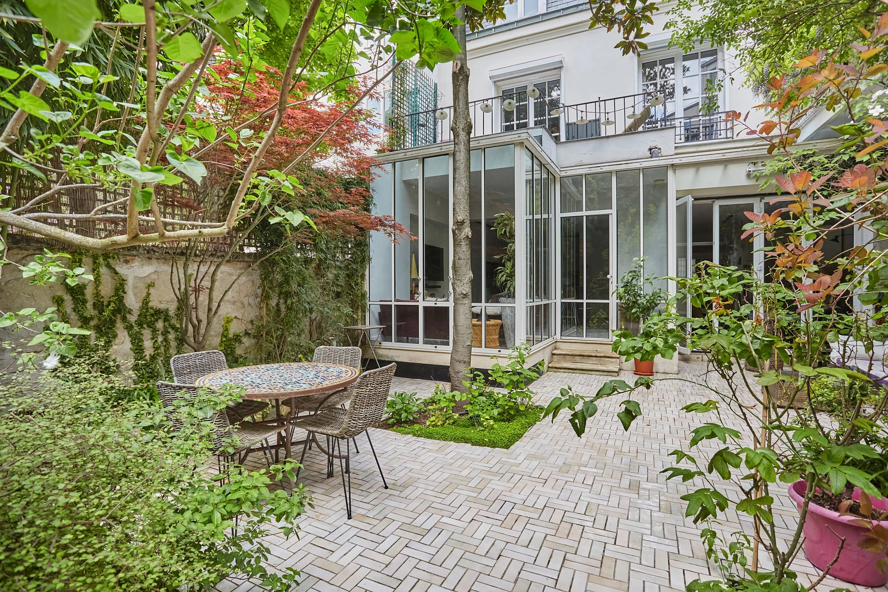An exceptional family house with an elevator and a sunny garden is located on a quiet Parisian street near the popular green promenade Promenade Pereire and the legendary Lebon market.