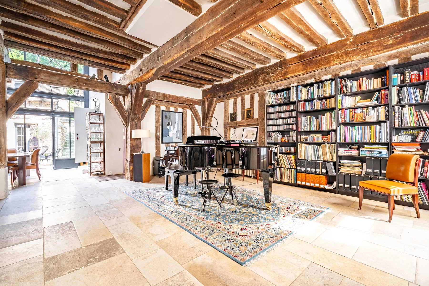 The ground floor interior comprises an impressive living room of over 100 m² with a monumental fireplace, a partially open kitchen, a pantry, a glazed winter garden with a double-height ceiling and access to a paved courtyard, as well as a study and a bathroom. The first floor features a spacious main suite with a bathroom and walk-in closet, two additional bedrooms, a bathroom, a laundry room, and another versatile room of 85 m². The basement retains its original vaulted ceilings.
