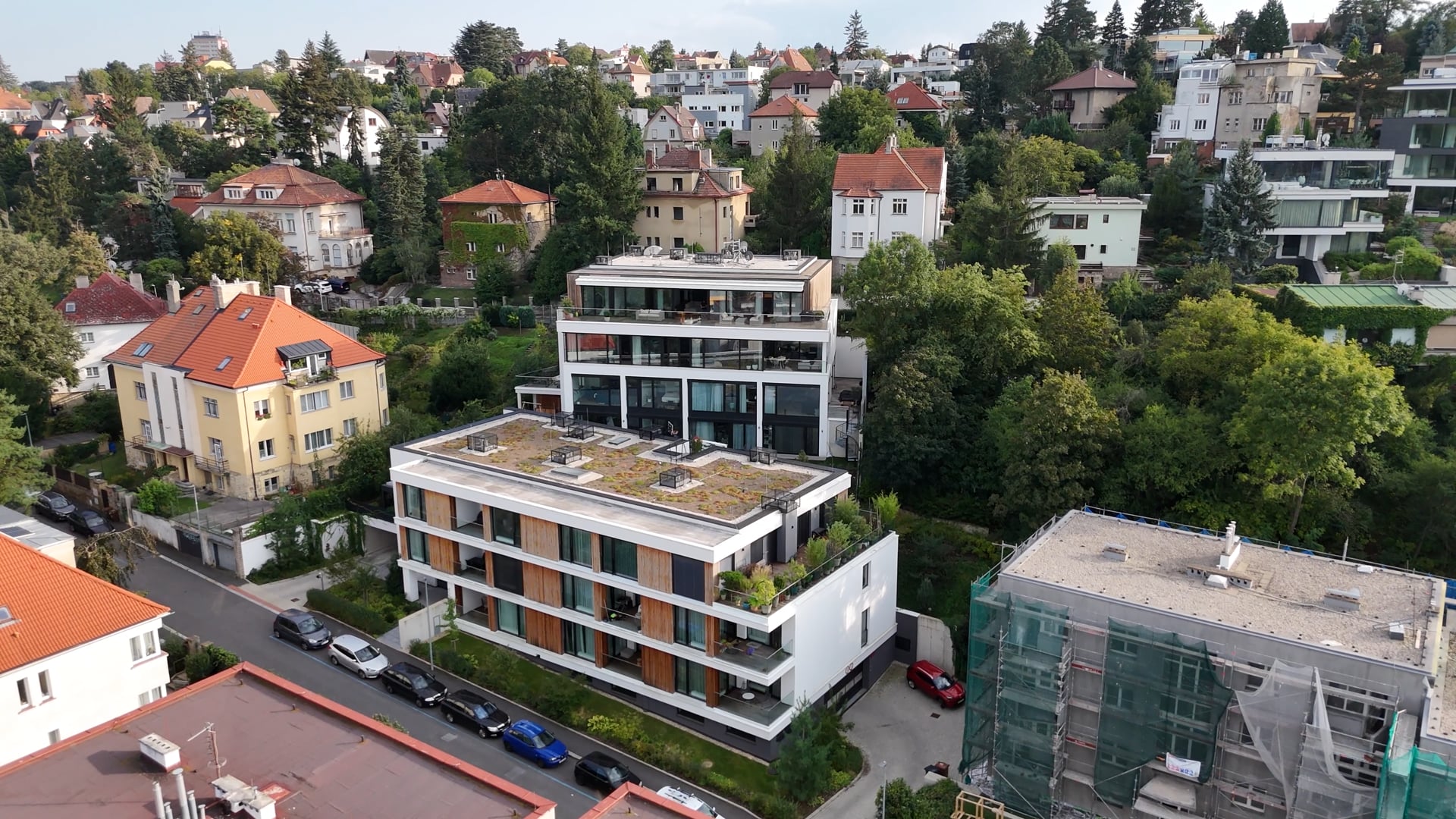 Fully equipped apartment on the 2nd top floor of a new building with an elevator with direct access to the apartment. The over 70-meter living room with a dining area is followed by a separate kitchen with utility facilities and a toilet. The master bedroom is accessed through a spacious walk-in wardrobe, adjacent to which is a bathroom with a shower and bathtub. On the opposite side of the apartment are 3 more bedrooms, 2 bathrooms, a toilet, and a hallway. From each room, it is possible to enter one or both terraces with a fascinating view. The apartment includes 2 parking spaces with the possibility of recharging electric cars and a generous cellar cubicle, both on the 3rd underground floor. The new building from 2021 is surrounded by greenery accessible to all residents of the building.