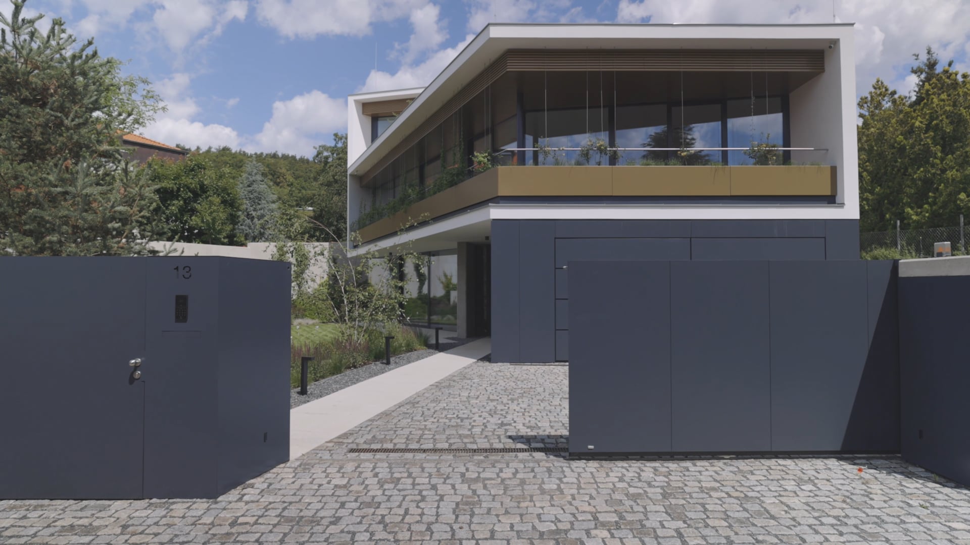 The house, approved in September 2023, was designed by a renowned architectural studio. Floors are wooden, the large floor-to-ceiling windows have built-in curtain rails, the rooms are decorated with designer lamps, the bathrooms are decorated in marble, and the built-in wardrobes offer plenty of storage space. Facilities include photovoltaic panels, air-conditioning, a smart home system, and a preparation for a heat pump. The kitchen is equipped with a Technistone worktop and Miele appliances. The professionally established garden providing welcome privacy is maintained by automatic irrigation connected to a retention tank. The garden has a preparation for an outdoor kitchen and a swimming pool. Parking for 2-3 cars is provided in the garage with direct access to the house.