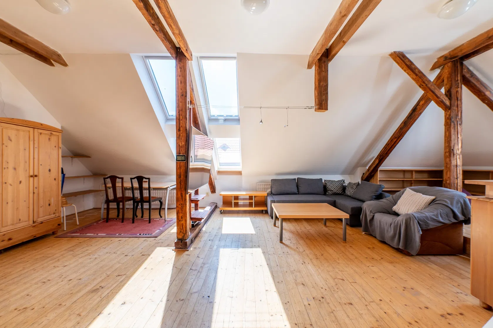 3. NP: Stylový 2pokojový podkrovní byt s přiznanými dřevěnými trámy, otevřenou obývací zónou, plně vybavenou kuchyní, ložnicí, koupelnou a komorou.