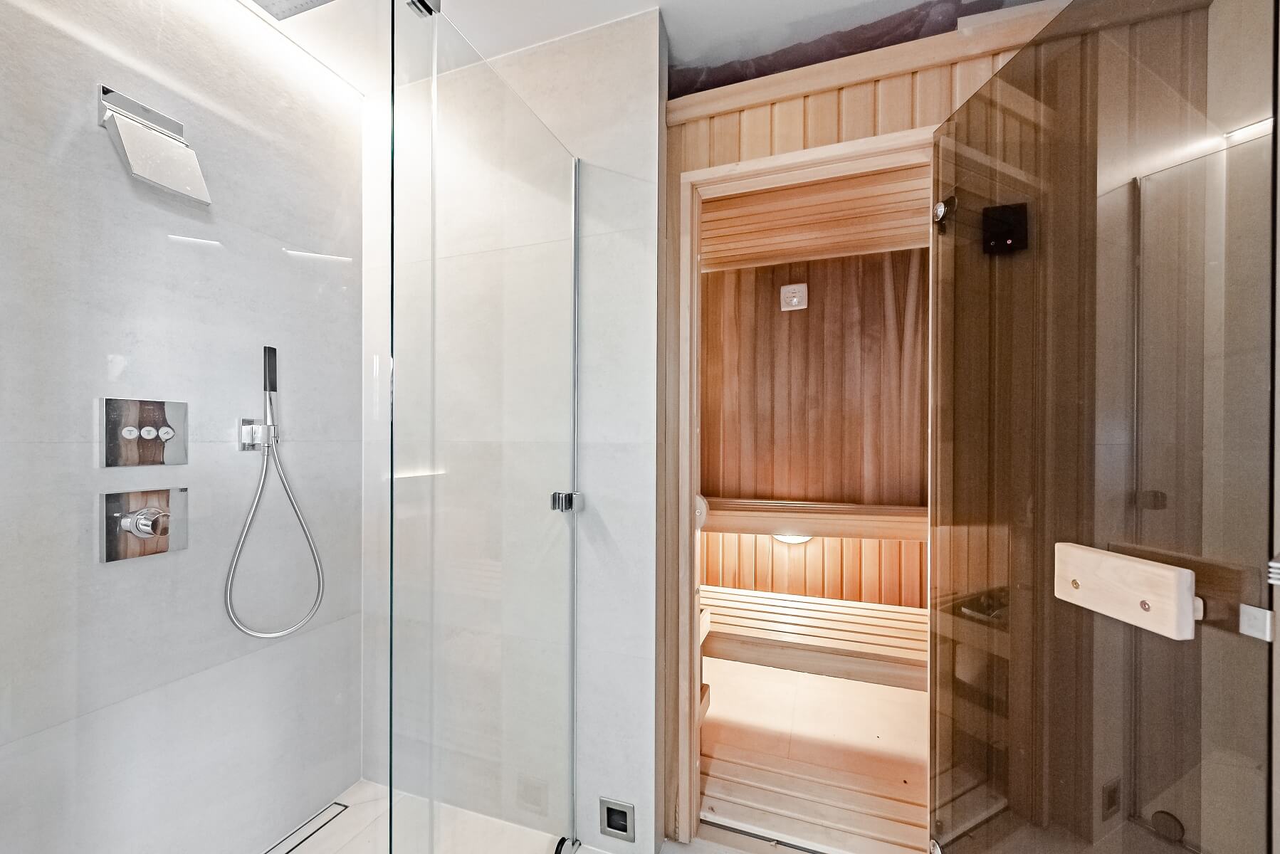 Dispozici vstupní úrovně bytu (4. patro z úrovně hlavního vstupu a 2. patro z úrovně lávky) tvoří kuchyně s barovým posezením, jídelní a relaxační kout s krbem, koupelna (s vanou a WC), vstupní hala a technické zázemí. Dřevěné schodiště vede do horního podlaží, kde se nachází velkoryse pojatý klimatizovaný obytný prostor se vstupem na severozápadní terasu i zastřešenou severovýchodní terasu, dále 3 ložnice (1 se spacím patrem), koupelna se sprchovým koutem i saunou a samostatná toaleta. Z obytného prostoru vede ještě schodiště na galerii.