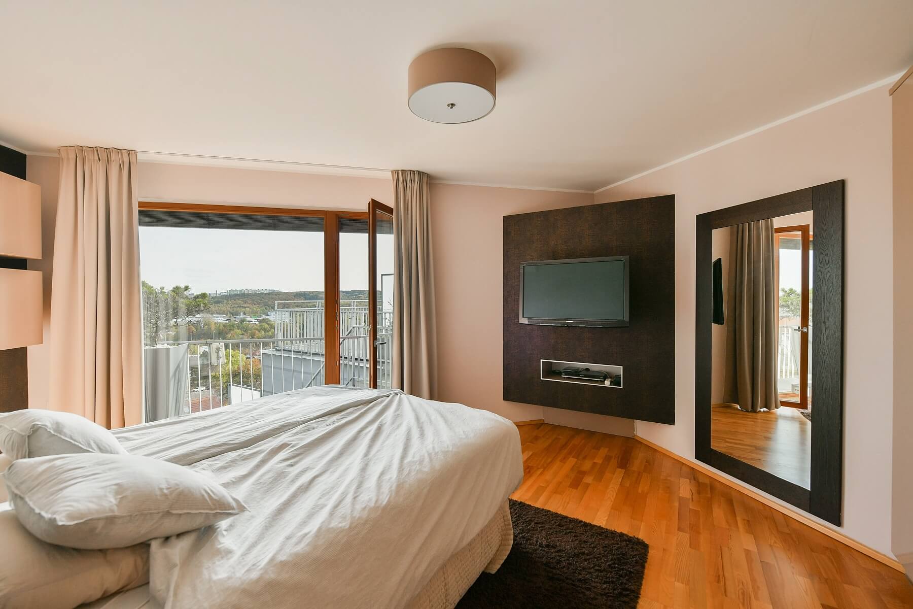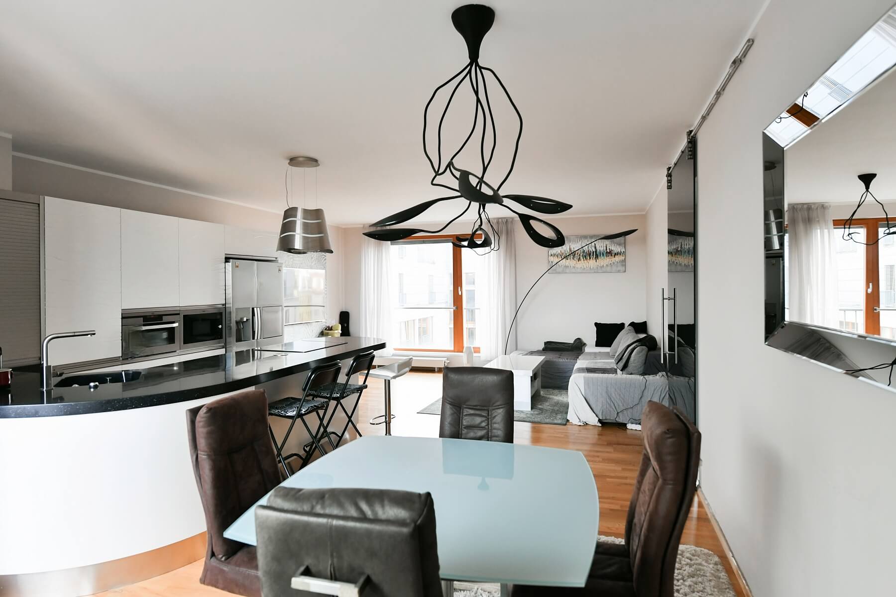 Vstupní úroveň bytu tvoří obývací pokoj s kuchyní a přístupem na terasu, koupelna (masážní sprchový kout s oknem, WC) a vstupní hala. V horním patře se nachází hlavní ložnice s přístupem do zimní zahrady se saunou, druhá ložnice, vzdušná koupelna (vana se sprchovou zástěnou, 2 umyvadla, bidet, WC) a vybavená šatna. Z obou ložnic vede vstup na terasu, dolní i horní terasa jsou propojeny venkovním schodištěm.