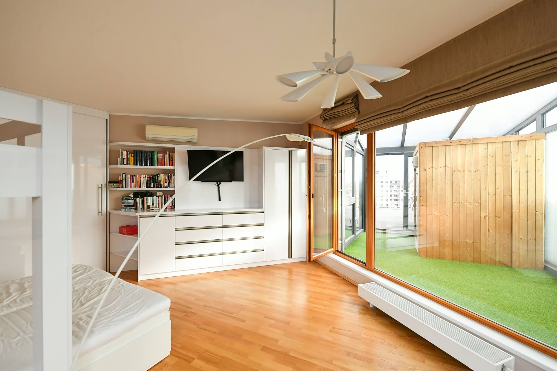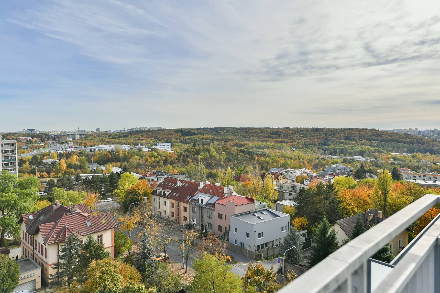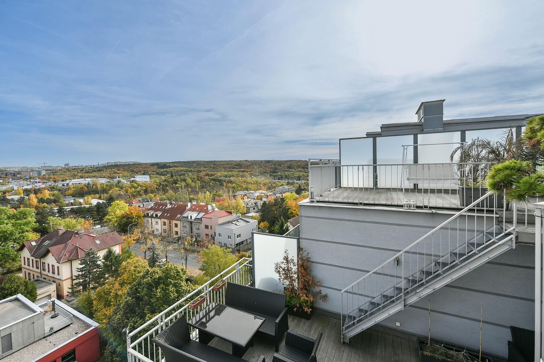 Klimatizovaný mezonetový byt se saunou, 2 terasami a krásným výhledem do dalekého okolí je umístěn v 7. patře moderního bytového domu s výtahem, 24/7 ostrahou, společným upraveným zeleným vnitroblokem a podzemním parkováním, kde jsou k bytu vyhrazena 2 místa. Architektonicky zdařilý dům v pěkně zelené čtvrti s mnoha dětskými hřišti má výhodnou polohu u stanice metra Kačerov a Budějovická.