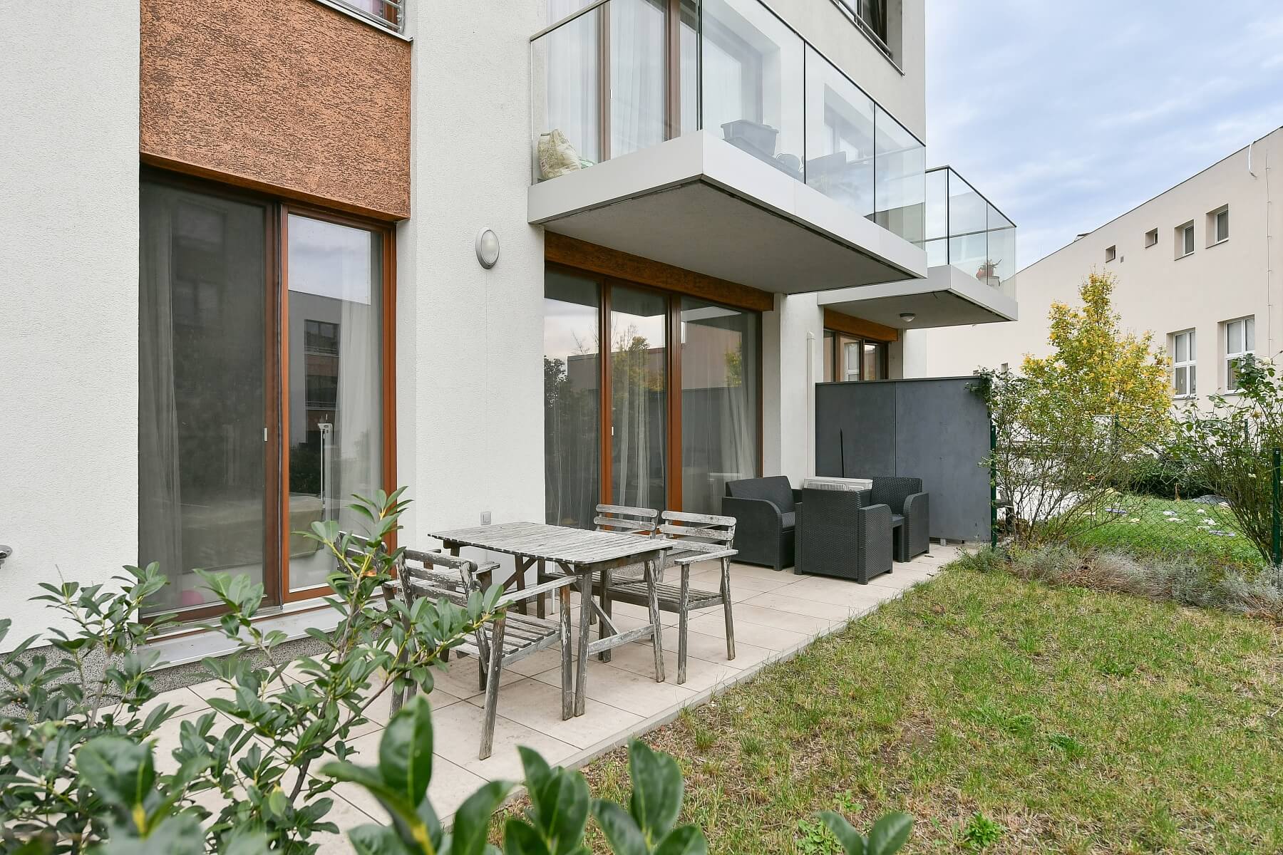 Moderní klimatizovaný byt s terasou, předzahrádkou a garážovým stáním v projektu Rezidence nad Vltavou, v oblíbené čtvrti Praha 7 – Holešovice s výbornou dostupností a vším potřebným na dosah ruky.
