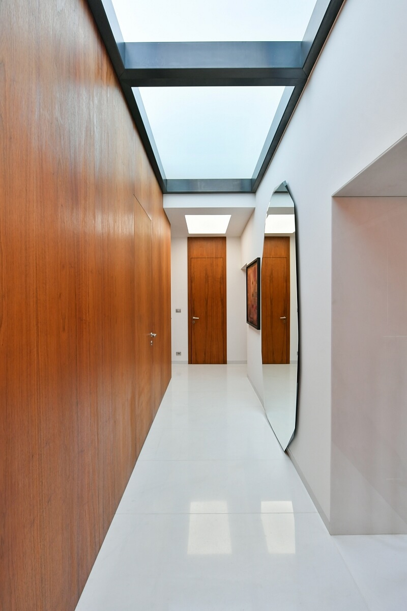 Vstupní úrovni (5. podlaží domu) vévodí velký obývací pokoj otevřený do krovu, dále je zde kuchyně, ložnice s balkonkem, koupelna, toaleta, 2 šatny, technická místnost s přípojkou na pračku a předsíň. Ve druhé úrovni je hlavní ložnice s prostornou klimatizovanou koupelnou, se solitérně stojící vanou, onyxovou dlažbou a ateliérovým oknem. Vytápěná zimní zahrada, která je využívaná jako pracovna, na niž navazuje malý balkon s výhledem na Pražský hrad. Dispozici doplňuje toaleta, šatna a vestavěné skříně v komunikační zoně. V celém bytě je klimatizace.