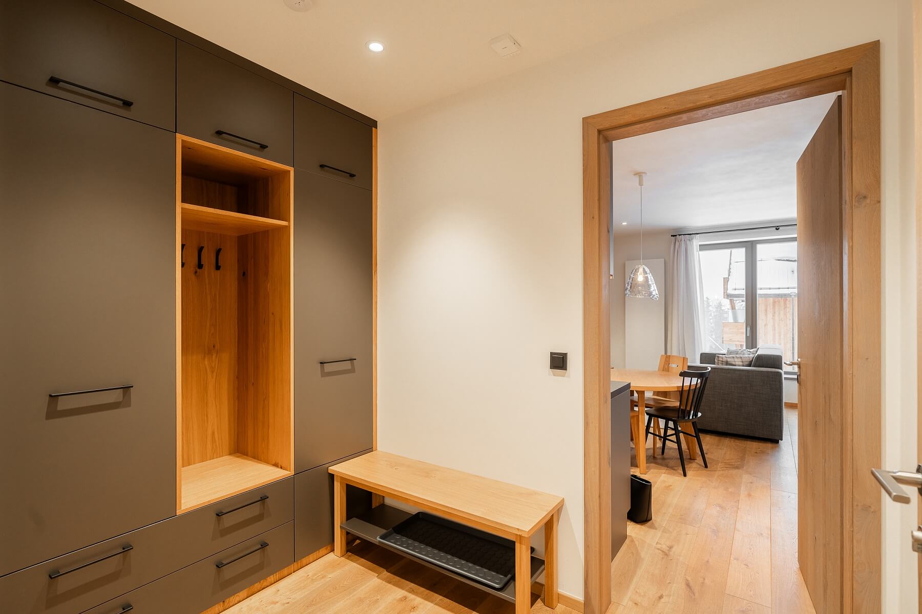 Plocha bytu umístěného v 1. podlaží je rozdělena na obytnou místnost s kuchyňským, jídelním a relaxačním a spacím koutem, koupelnu (s walk-in sprchou), samostatnou toaletu s umývátkem a předsíň. Na obytnou místnost navazuje 15metrová, jižně orientovaná terasa.