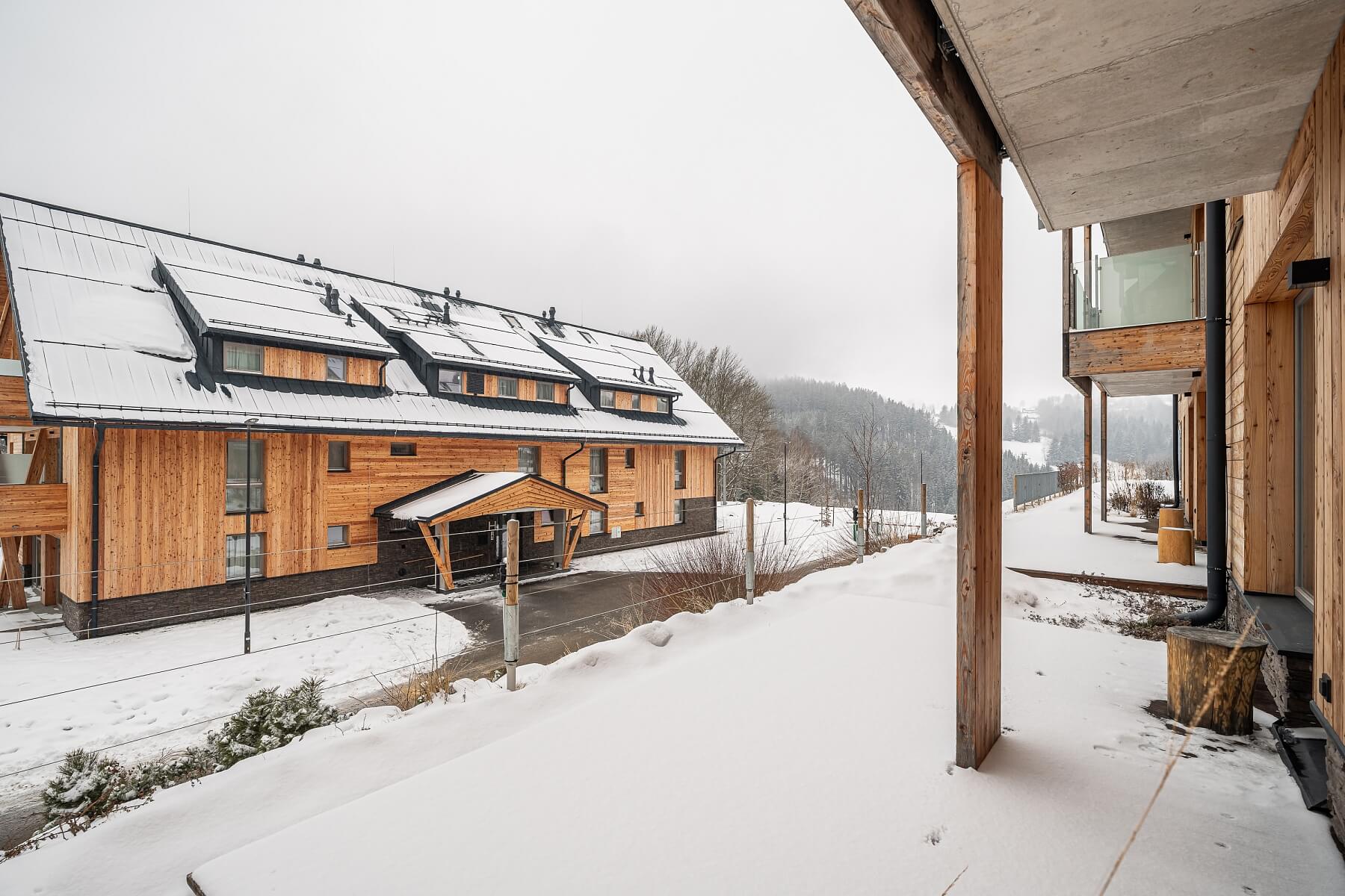 Celý bezbariérový komplex byl vystavěn s respektem k přírodě a úctou ke klasické krkonošské architektuře. Působivá kombinace dřeva, kamene, skla, betonu a dalších moderních materiálů zaručuje nadčasovost, využití masivního dřeva na zakázkovém ineriérovém vybavení vyvolává hřejivý pocit. K apartmánu přísluší široké (invalidní) garážové stání a sklep. S jednotkou je spojena smlouva s resortem o hotelovém provozu a pronájmu do konce r. 2032, majitelé mají byt k bezplatnému využití včetně všech služeb 6 týdnů v roce. Špičkový servis a vybavení resortu zahrnuje recepci, wellness a spa, bazén s vířivkou, lezeckou stěnu, restauraci s dětským koutkem, klimatizované fitness a sál pro jógu, dětskou hernu a venkovní hřiště, kolárnu i lyžárnu.