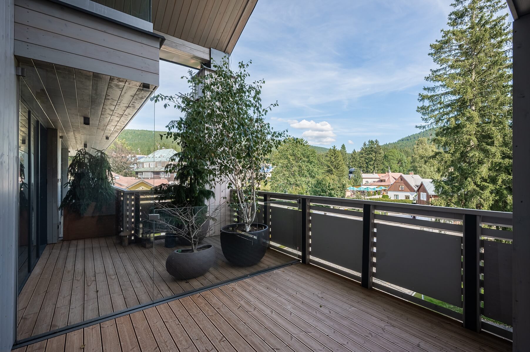 Nový apartmán s prostornou jihovýchodním balkonem se nachází ve 4. podlaží moderní budovy Corso Harrachov, vystavěné v centru vyhlášeného horského střediska, jen pár kroků od lanovky na Čertovu horu. Resort poskytuje špičkový servis, a tak je byt vhodný nejen pro vlastní rekreaci, ale i ke krátkodobým pronájmům.