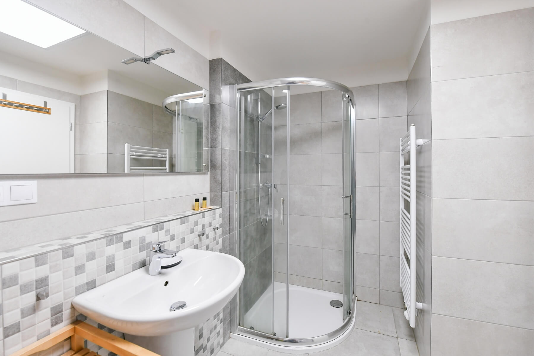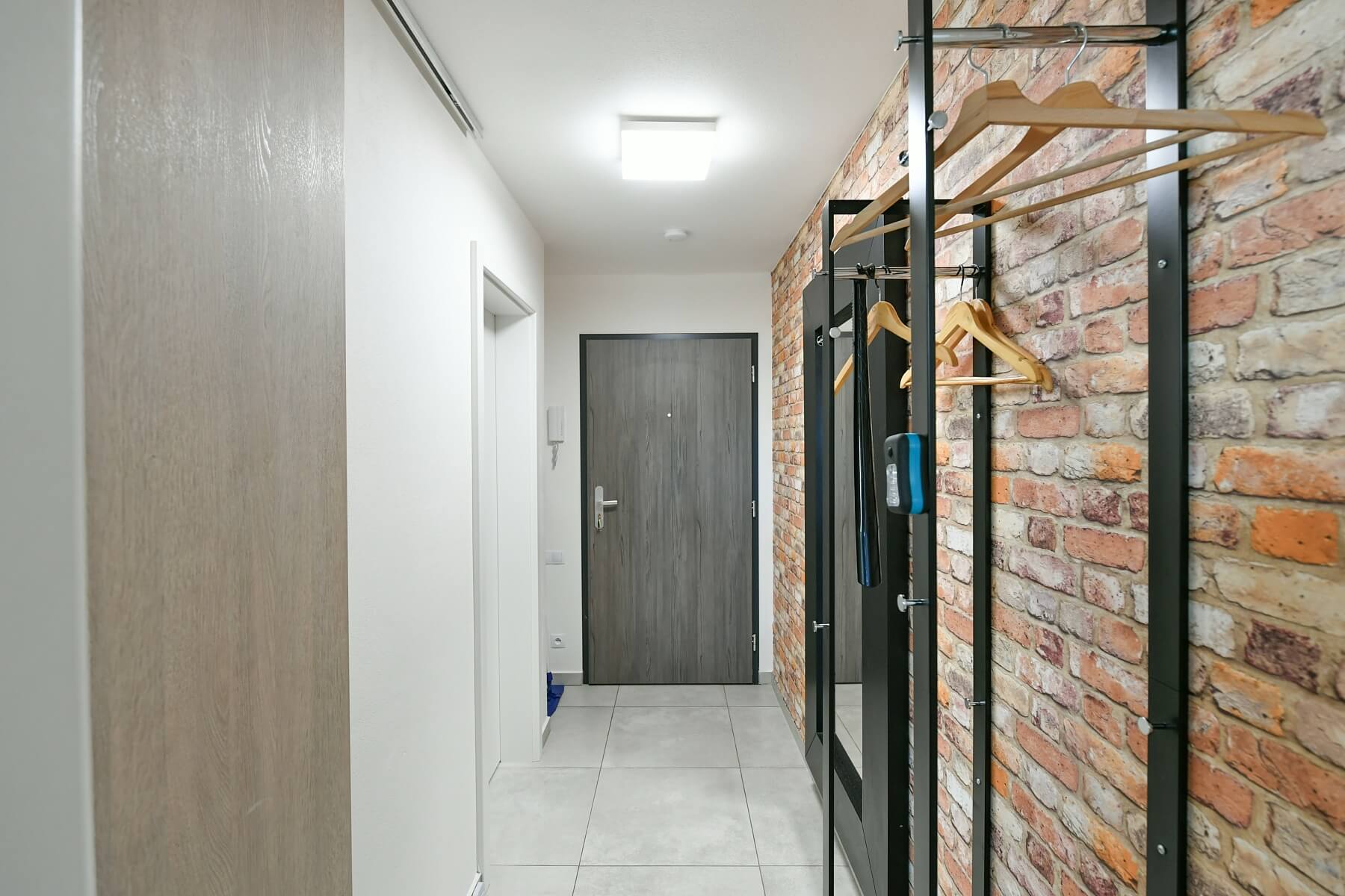 Ve vstupní úrovni je obývací pokoj s otevřenou kuchyní a vstupem na balkón, koupelna (se sprchou, WC, umyvadlem a pračkou) a zádveří. Na galerii v podkroví se rozkládá prostorná ložnice.