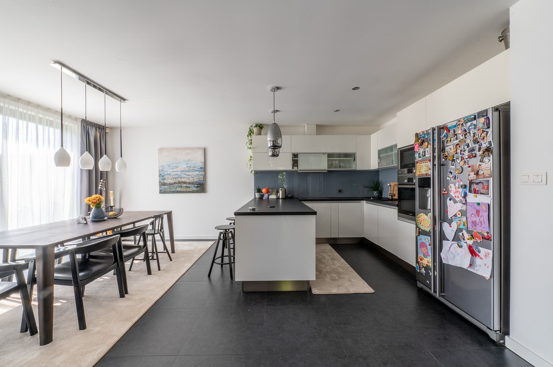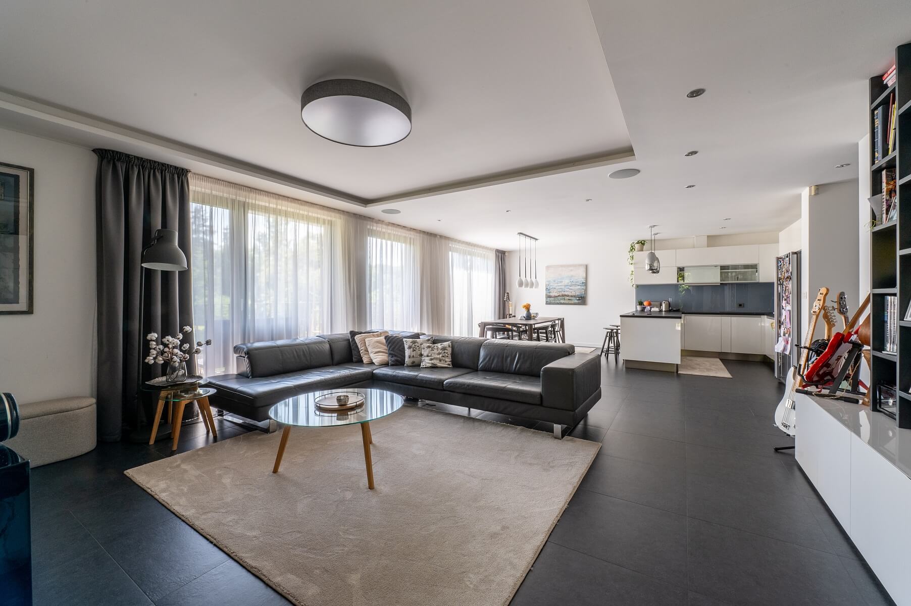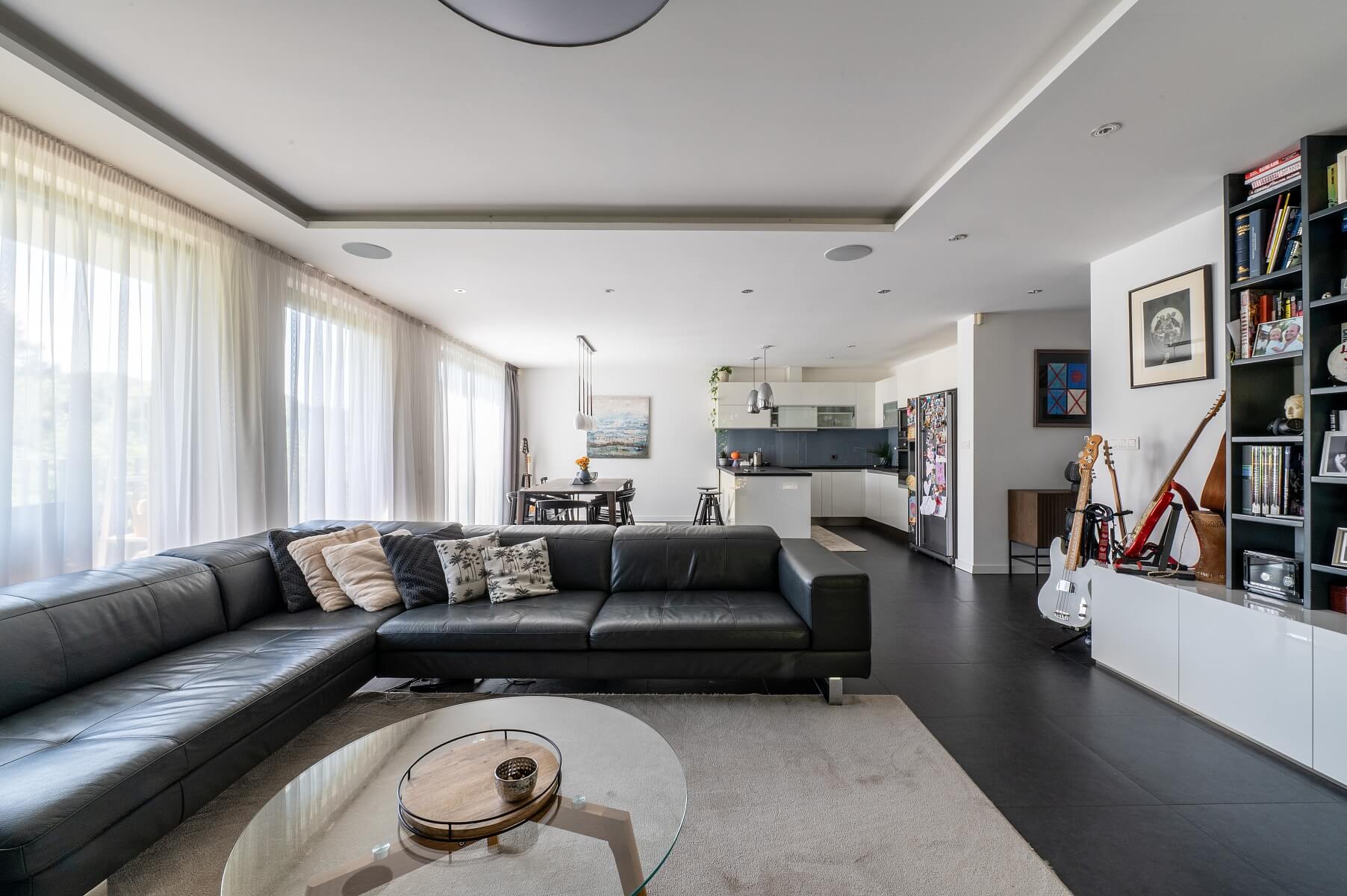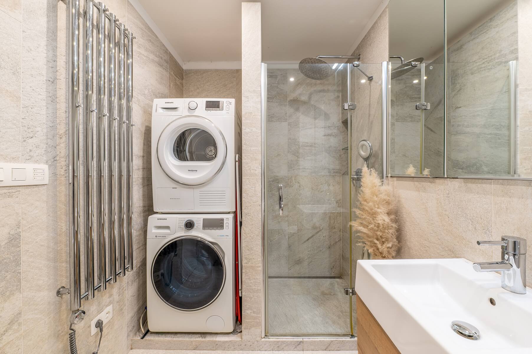 Interiér bytu je kompletně zařízen nábytkem na míru a vybaven vestavěnými spotřebiči renomovaných značek. Kuchyně je vybavena elektrickou troubou, vestavěným kávovarem, americkou lednicí s výrobníkem ledu a varným ostrůvkem s barovým sezením. Velkoformátová okna s venkovními žaluziemi zajišťují dostatek denního světla i soukromí. K vybavení patří klimatizace, designové osvětlení, kožená sedačka a množství úložného prostoru. K bytu náleží dvě parkovací místa v podzemní garáži, každé v hodnotě 30 000 EUR.