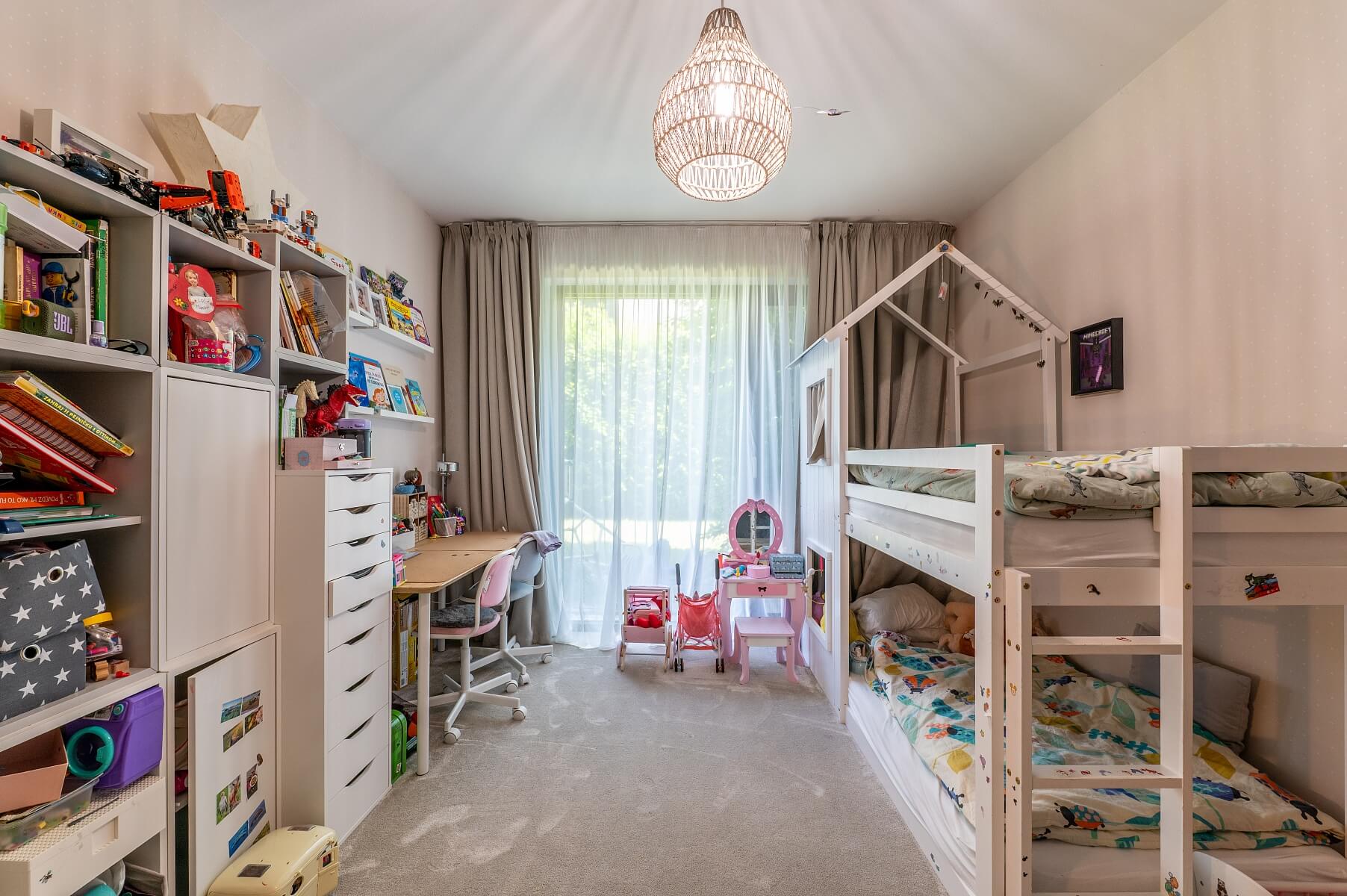 Byt s podlahovou plochou 106 m² se nachází v prvním patře a skládá se z otevřené denní zóny a dvou samostatných pokojů. Vstupní chodba je vybavena vestavěnými šatními skříněmi a plynule navazuje na obývací pokoj propojený s jídelní částí a kuchyní. Z obývacího pokoje je přímý vstup na jižně orientovanou terasu o rozloze cca 12 m² a do soukromé zahrady o výměře 147 m². Noční část bytu tvoří hlavní ložnice s přístupem na terasu a druhý pokoj, který může sloužit jako dětský pokoj nebo pracovna. Koupelna je vybavena vanou, sprchovým koutem a toaletou, další samostatná toaleta s umyvadlem je situována u vstupu do bytu.