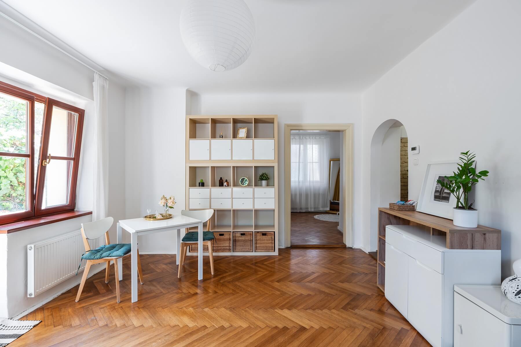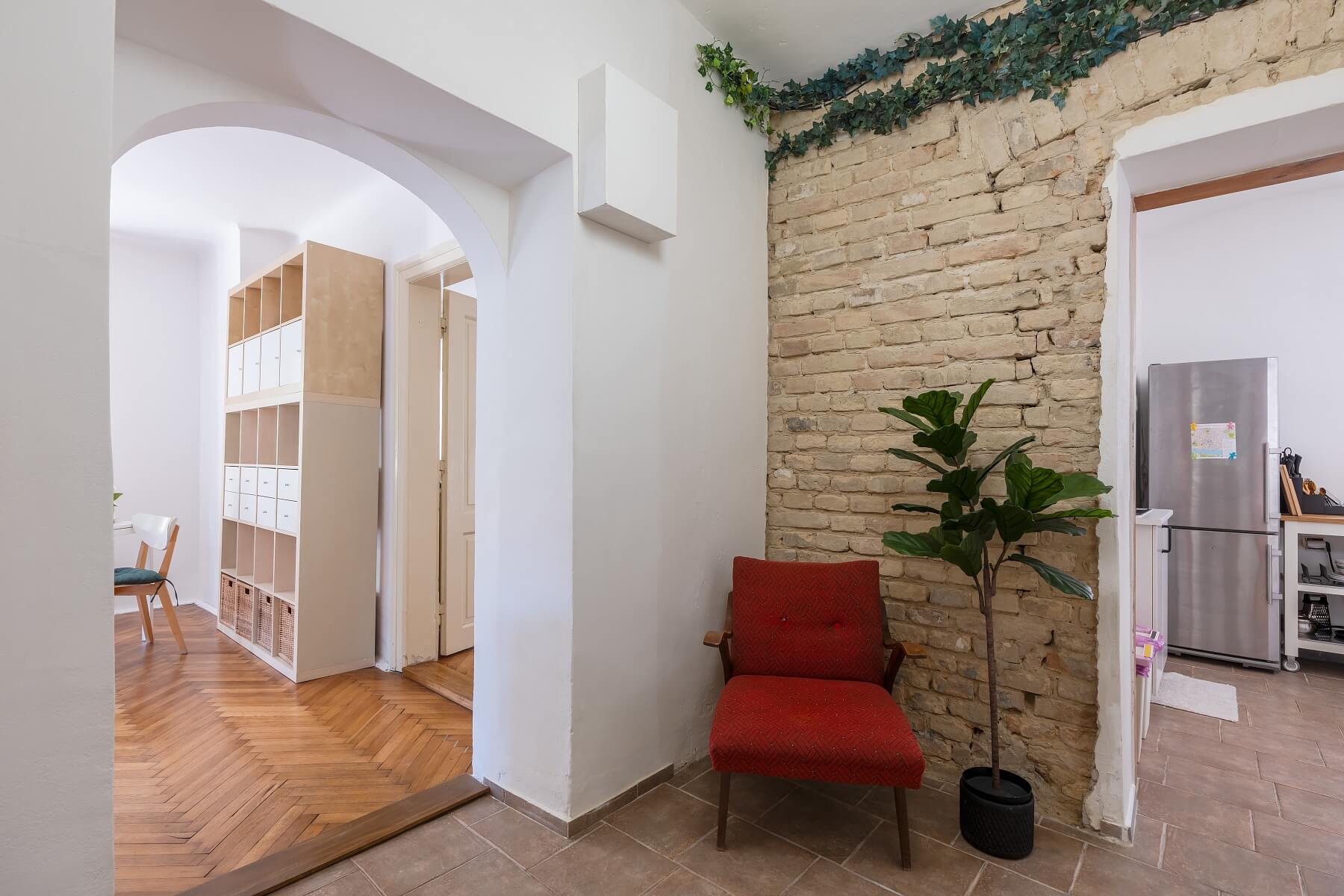 Byt o výměře 70,18 m² (včetně sklepa) se skládá z prostorného obývacího pokoje s přímým vstupem do soukromé předzahrádky, samostatné ložnice, koupelny a kuchyňské části. Každý detail interiéru byl promyšleně obnoven tak, aby spojoval historický charakter stavby s moderním komfortem – byt zabírá celé podlaží vily, bez sdílení prostoru se sousedy.