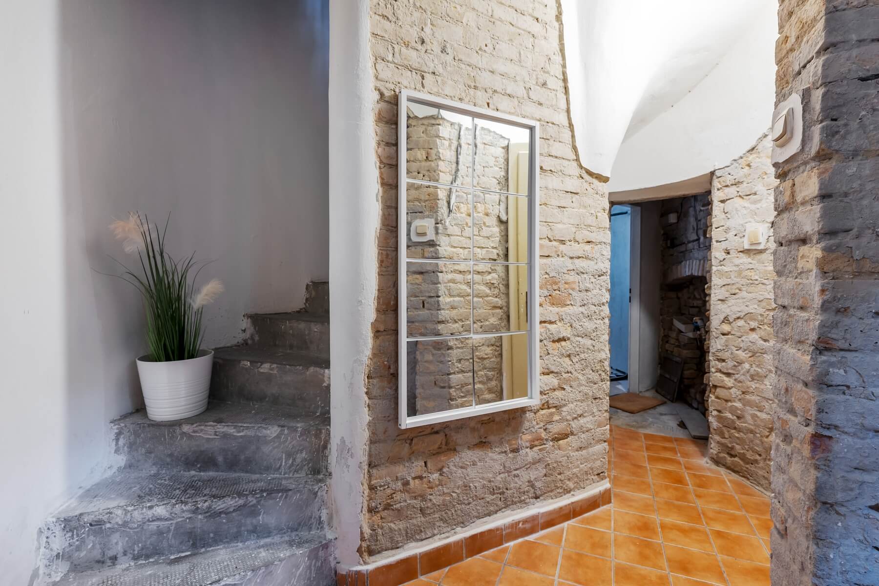 Při rekonstrukci byly použity kvalitní materiály: dubová podlaha, pohledové cihly, nová sanita a rozvody. Vytápění zajišťuje nový plynový kotel, plastová okna zajišťují výbornou izolaci. K bytu náleží také částečně zrekonstruovaný klenbový sklep (10 m²), který je možné propojit s bytem jako třetí místnost nebo ateliér. Součástí je i podíl na půdě a pozemku a možnost vybudování krbu díky zachovanému komínu. Měsíční náklady nepřesahují 100 € včetně energií.