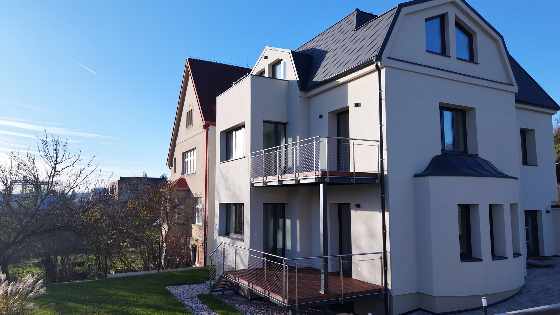 Dubové podlahy pokládané do elegantního vzoru chevron podtrhují historický charakter domu. Okna i prosklené dveře na terasu jsou osazeny trojskly, které zajišťují výbornou tepelnou i zvukovou izolaci. Koupelnu vybavenou sanitou Villeroy & Boch a Hansgrohe zdobí velkoformátové obklady a dlažba italského výrobce Casalgrande Padana. Vytápění i chlazení zajišťuje podlahový systém napojený na tepelné čerpadlo s možností ovládání přes mobilní aplikaci, v obývacím pokoji a přilehlé ložnici navíc k dispozici klimatizační jednotky. Budova nově splňuje energetickou náročnost třídy B, což garantuje úsporný provoz.