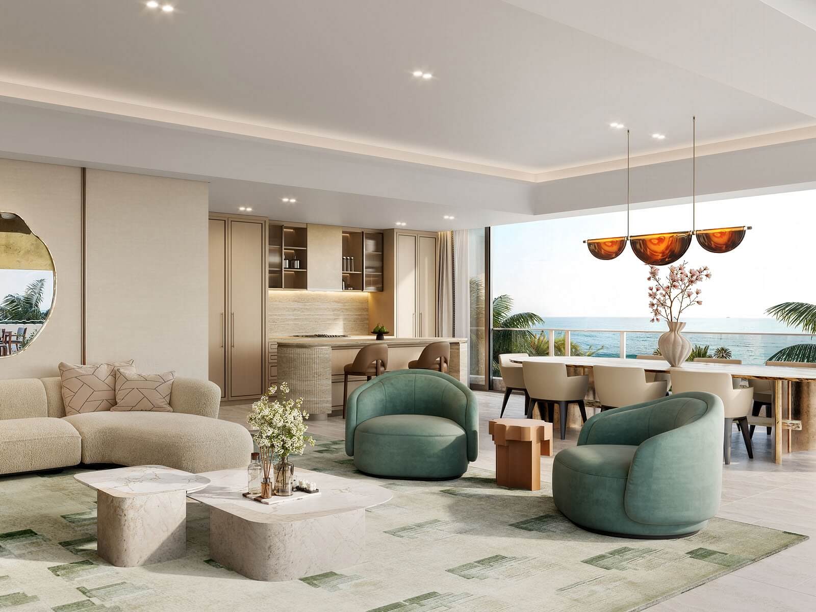 Byt vyniká výjimečným designem vytvořeným z prémiových materiálů a otevřený půdorys umožňuje plynulý přechod mezi interiérem a venkovními prostory. Vybavení zahrnuje vestavěný nábytek a kompletně zařízenou kuchyňskou linku (lednice s mrazákem, varná deska, trouba, pračka). Budoucí majitelé mohou využívat výhody bydlení ve Fairmont Residences, jako je přístup k bazénům včetně sky bazénu, modernímu wellness a fitness centru, kinu a dalším službám. Samozřejmostí je nepřetržitá ostraha areálu, který disponuje také širokým výběrem restaurací a obchodů.