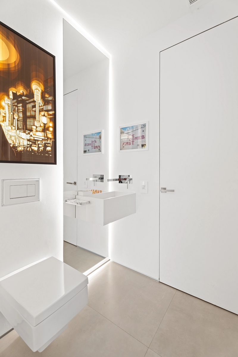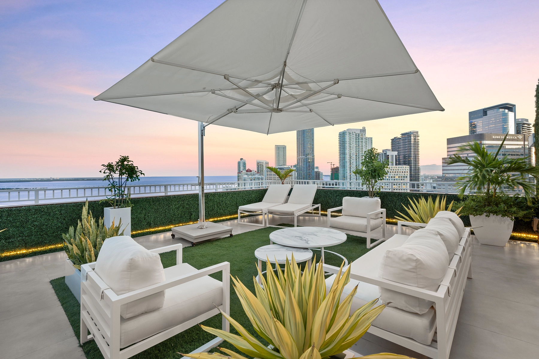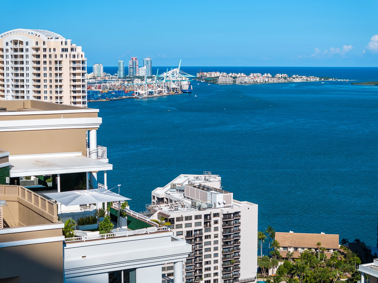 Elegantní a prudce moderní dvoupodažní penthouse s rozlehlou střešní terasou a bezkonkurenčními výhledy na záliv Biscayne Bay je situován v nejvyšších patrech rezidence Courts Brickell Key v ostrovní části Brickellu v Miami.