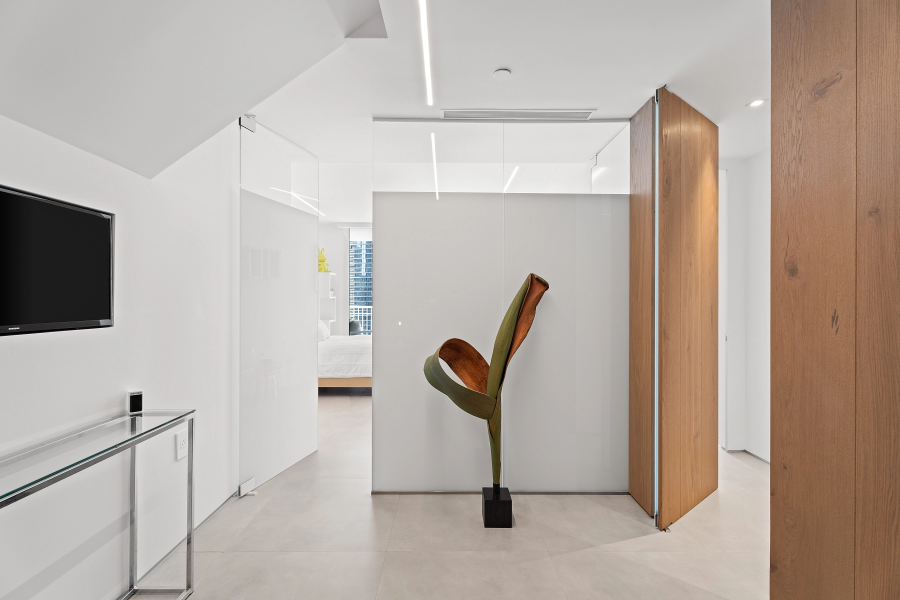 Na hlavní obytnou zónu sestávající z otevřené kuchyně s jídelnou a prostorným lounge navazuje pobytová částečně krytá terasa s barem a posezením. Interiér spodního patra, které je situováno ve 33. podlaží, dále tvoří průchozí odpočinková zóna, hlavní ložnice s walk-in šatnou, koupelnou a vstupem na terasu, samostatná toaleta a prádelna. V horním patře jsou umístěny 2 ložnice s vlastními koupelnami a s přístupem na společnou terasu. K bytu náleží 3 parkovací stání.