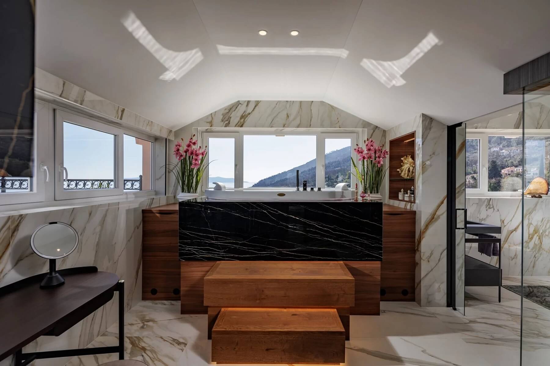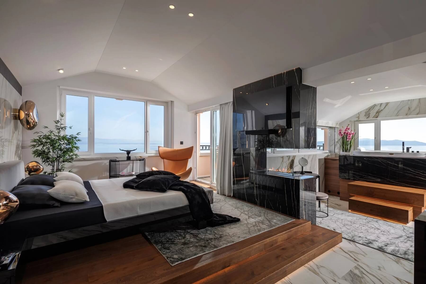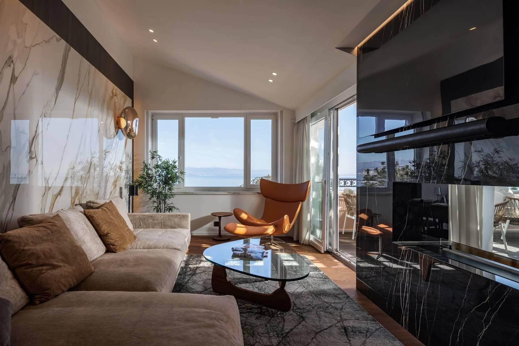 Opatija se proslavila jako lázeňské letovisko habsburské šlechty s typickou architekturou a nabízí mírné středomořské klima, kvalitní hotely, lokální obchody a vyhlášené restaurace. Penthouse se nachází v docházkové vzdálenosti od promenády Lungomare a pláží. Mezinárodní letiště v Rijece je vzdálené přibližně 45 km.