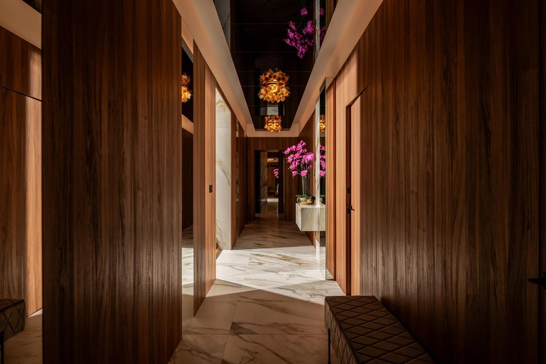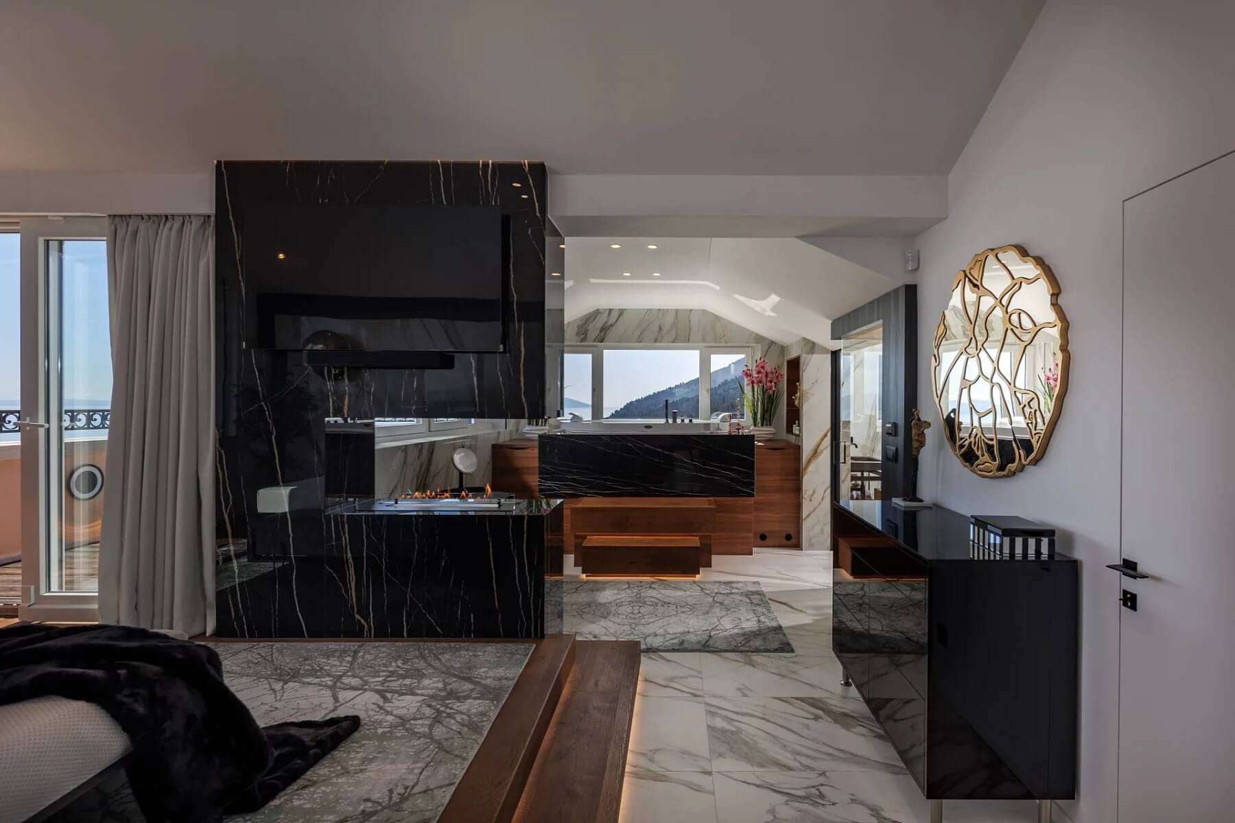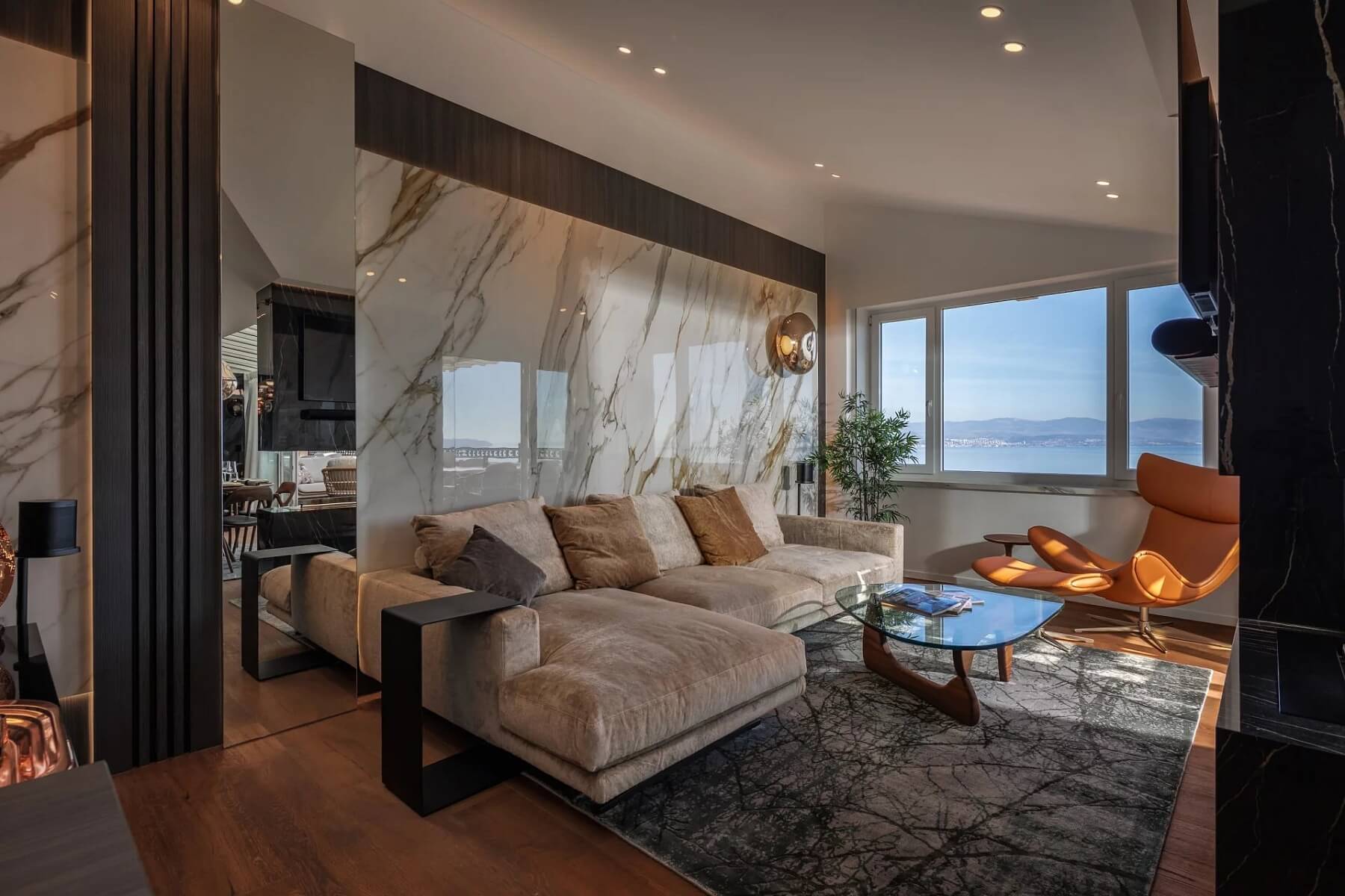 Z impozantního vchodu se vchází do elegantního foyer, které vede do vyvýšeného otevřeného obývacího prostoru. Kompletně vybavená kuchyně od Dietera Knolla se spotřebiči Miele, jídelna, obývací pokoj a terasa na sebe plynule navazují a podporují tak společenskou interakci a soudržnou atmosféru. Hlavní apartmá tvoří vyvýšená spací část s krbem, přístup na druhou terasu a soukromé wellness prostory (vířivka s chromoterapií, sauna s výhledem na moře a dešťová sprcha Gessi na míru). Interiér zahrnuje také dvě další ložnice s en-suite koupelnami, toaletu pro hosty a prádelnu. Všechny ložnice jsou vybaveny skrytými audiovizuálními systémy, inteligentním osvětlením a automatickými okenními systémy.
