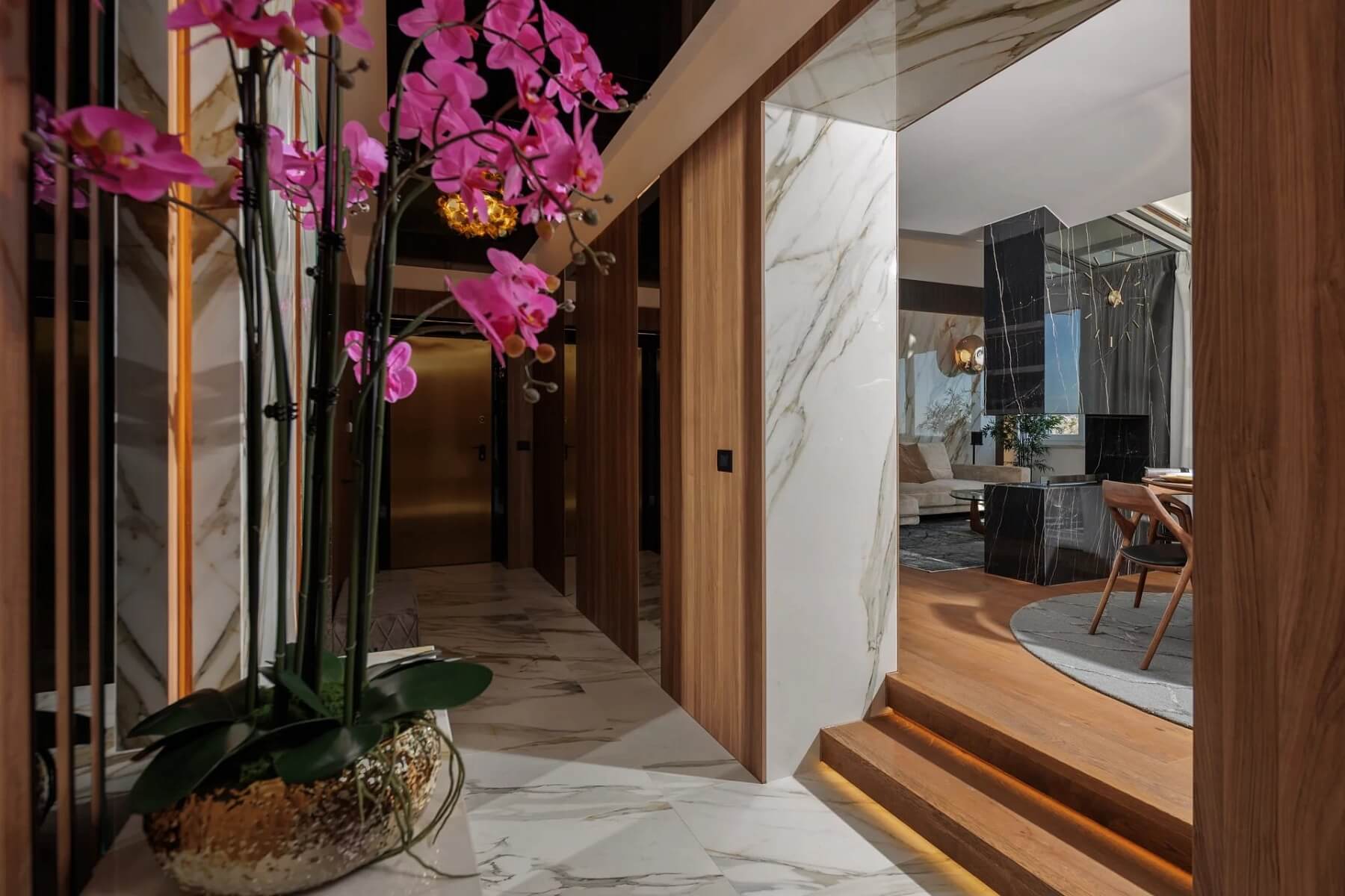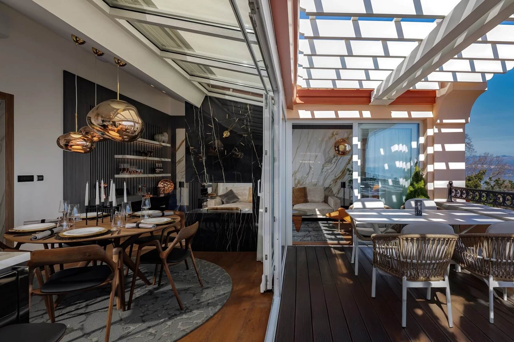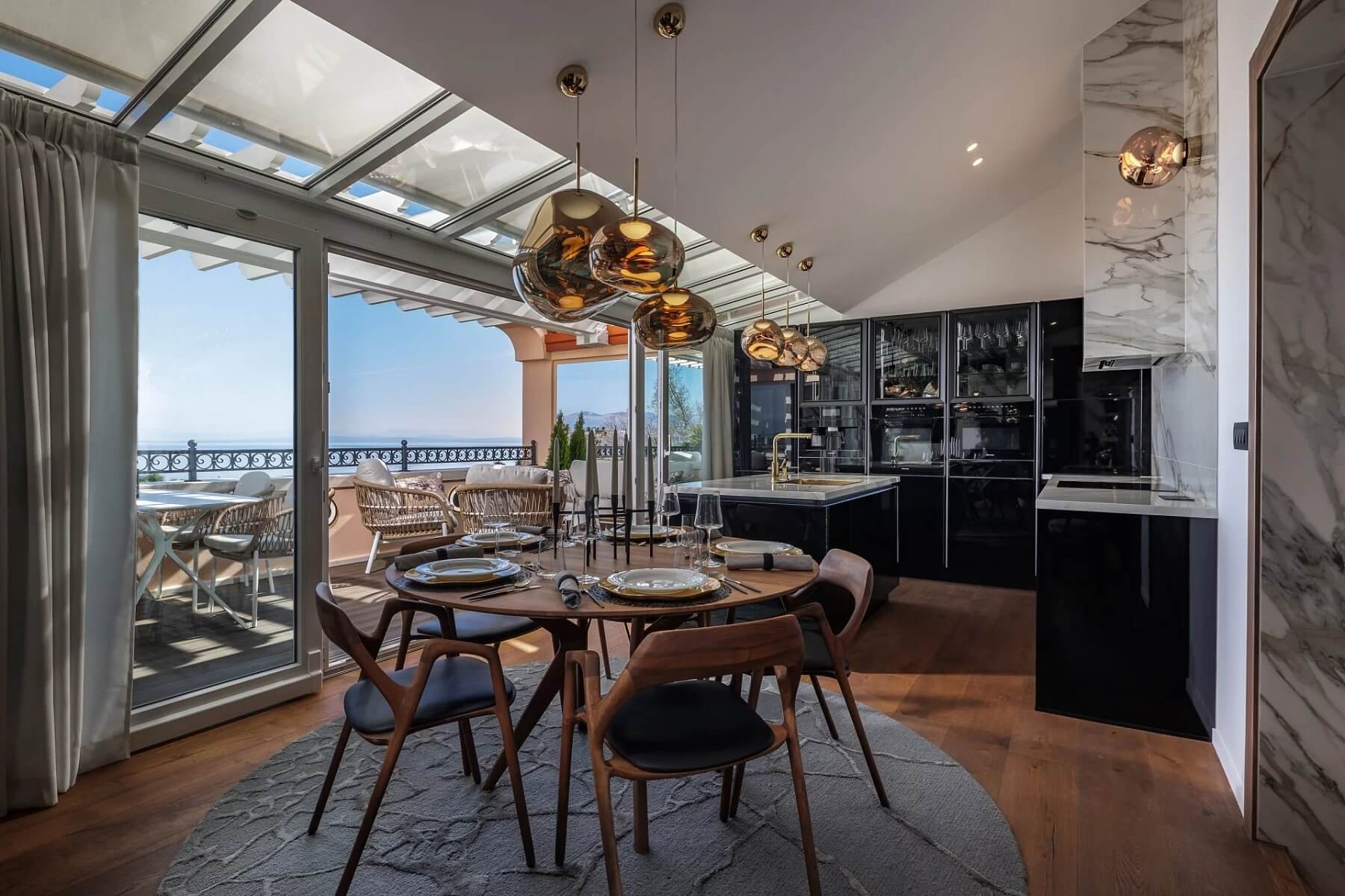 Z impozantního vchodu se vchází do elegantního foyer, které vede do vyvýšeného otevřeného obývacího prostoru. Kompletně vybavená kuchyně od Dietera Knolla se spotřebiči Miele, jídelna, obývací pokoj a terasa na sebe plynule navazují a podporují tak společenskou interakci a soudržnou atmosféru. Hlavní apartmá tvoří vyvýšená spací část s krbem, přístup na druhou terasu a soukromé wellness prostory (vířivka s chromoterapií, sauna s výhledem na moře a dešťová sprcha Gessi na míru). Interiér zahrnuje také dvě další ložnice s en-suite koupelnami, toaletu pro hosty a prádelnu. Všechny ložnice jsou vybaveny skrytými audiovizuálními systémy, inteligentním osvětlením a automatickými okenními systémy.