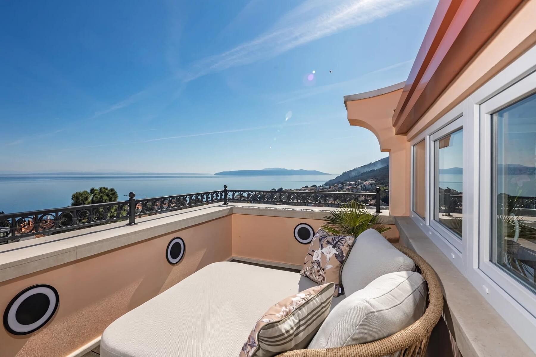Honosný čtyřpokojový byt s nerušeným výhledem na moře se rozprostírá v nejvyšším podlaží památkově chráněné historické vily se společným bazénem a službami concierge situované na prestižní Opatijské riviéře.