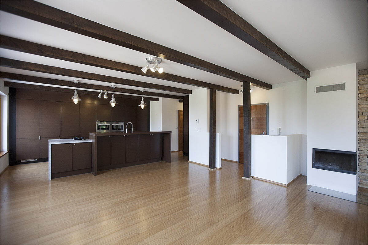 Interiér bytu nabízí otevřený koncept obývacího pokoje, jídelny a kuchyně, 3 ložnice (každá má vlastní přístup na terasu), 2 koupelny, šatnu a komoru. Použity nadstandardní materiály: dřevěné podlahy a okna, kamenný obklad na stěnách, odhalené trámy, vlastní kotel, krb. Kupní cena zahrnuje parkovací stání a sklep. Interiér 145,6 m2, terasy 13,6 m2 a 23,8 m2.
