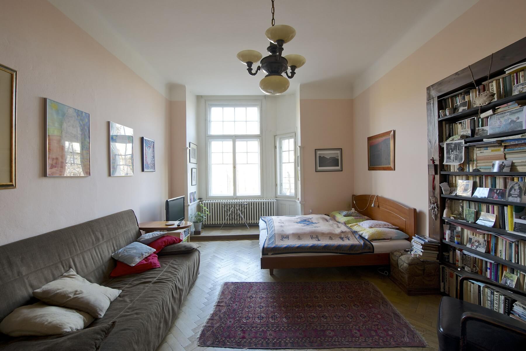 Světlý a prostorný byt v činžovním dvojdomu z roku 1912, významném příkladu architektonické moderny od Richarda Klenky s balkonem a unikátními arkýřovými okny poskytující výhled na Pinkasovu synagogu a Rudolfinum v bezpřostřední blízkosti Pařížské ulice a stanice metra Staroměstská.
