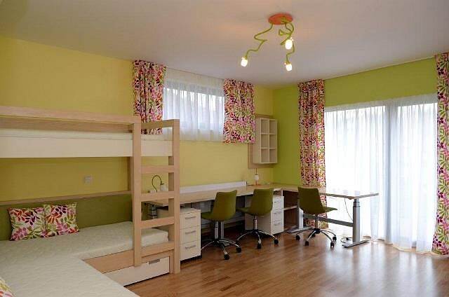 Interiér bytu s orientací na jih, východ a sever tvoří vstupní hala, prostorný obývací pokoj s moderní kuchyní se spotřebiči a jídelnou s přístupem na zahradu, 2 pokoje se vstupem na zahradu, 2 koupelny s vanou a toaletou a samostatná toaleta. Vybavení zahrnuje dřevěné podlahy, vestavěné skříně a venkovní žaluzie na elektrické ovládání. K bytu náleží 1 garážové stání a sklep.
