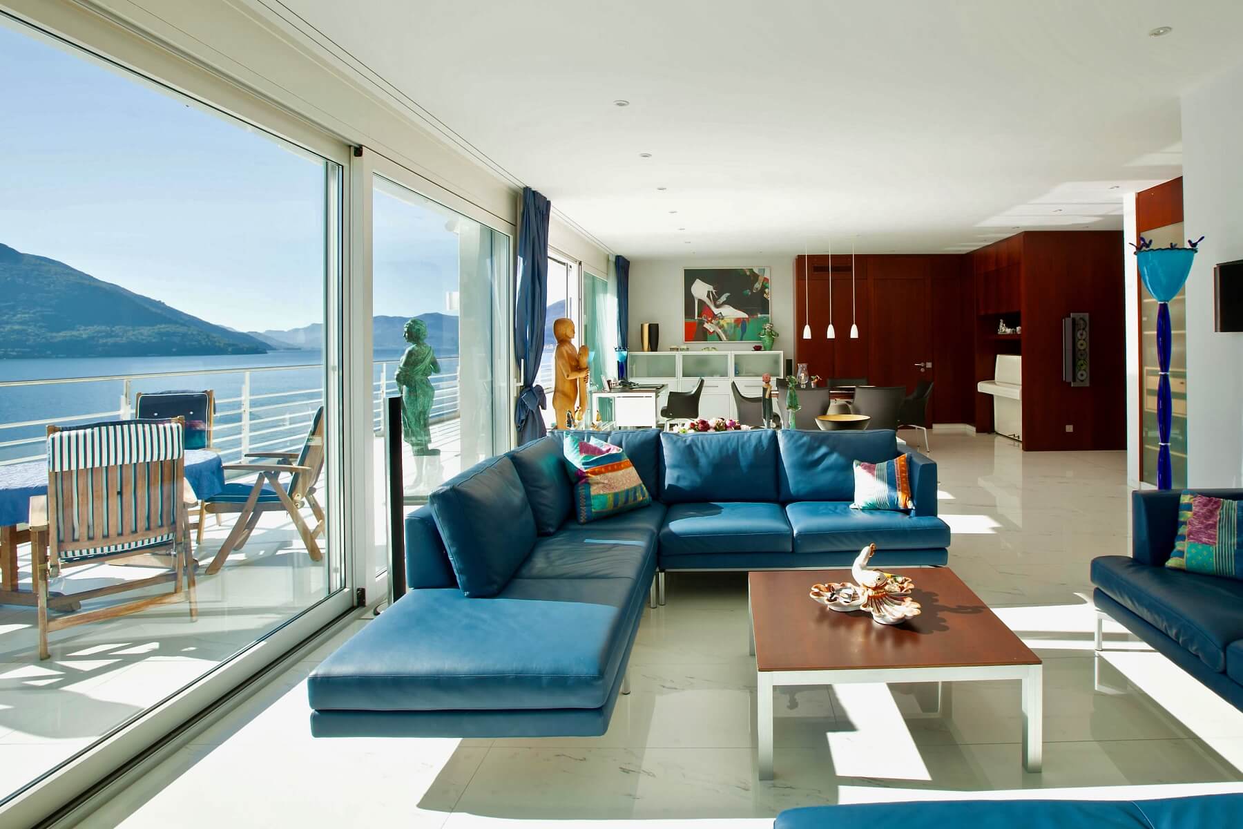 Jedinečný penthouse, který se pyšní prostornými terasami s otevřeným výhledem na průzračnou hladinu jezera, nabízí naprosto klidné bydlení na samém pobřeží Laggo Maggiore.