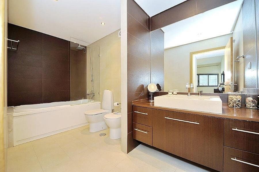 Vzdušný interiér bytu tvoří obývací pokoj (60 m2) s jídelním prostorem a přístupem na balkon, plně vybavená kuchyň, en-suite ložnice s koupelnou a šatnou, druhá ložnice a další koupelna. V bytě je klimatizace a centrální vysavač, k dispozici je i garáž pro 2 auta.