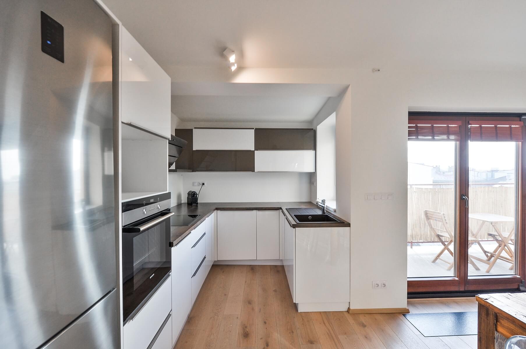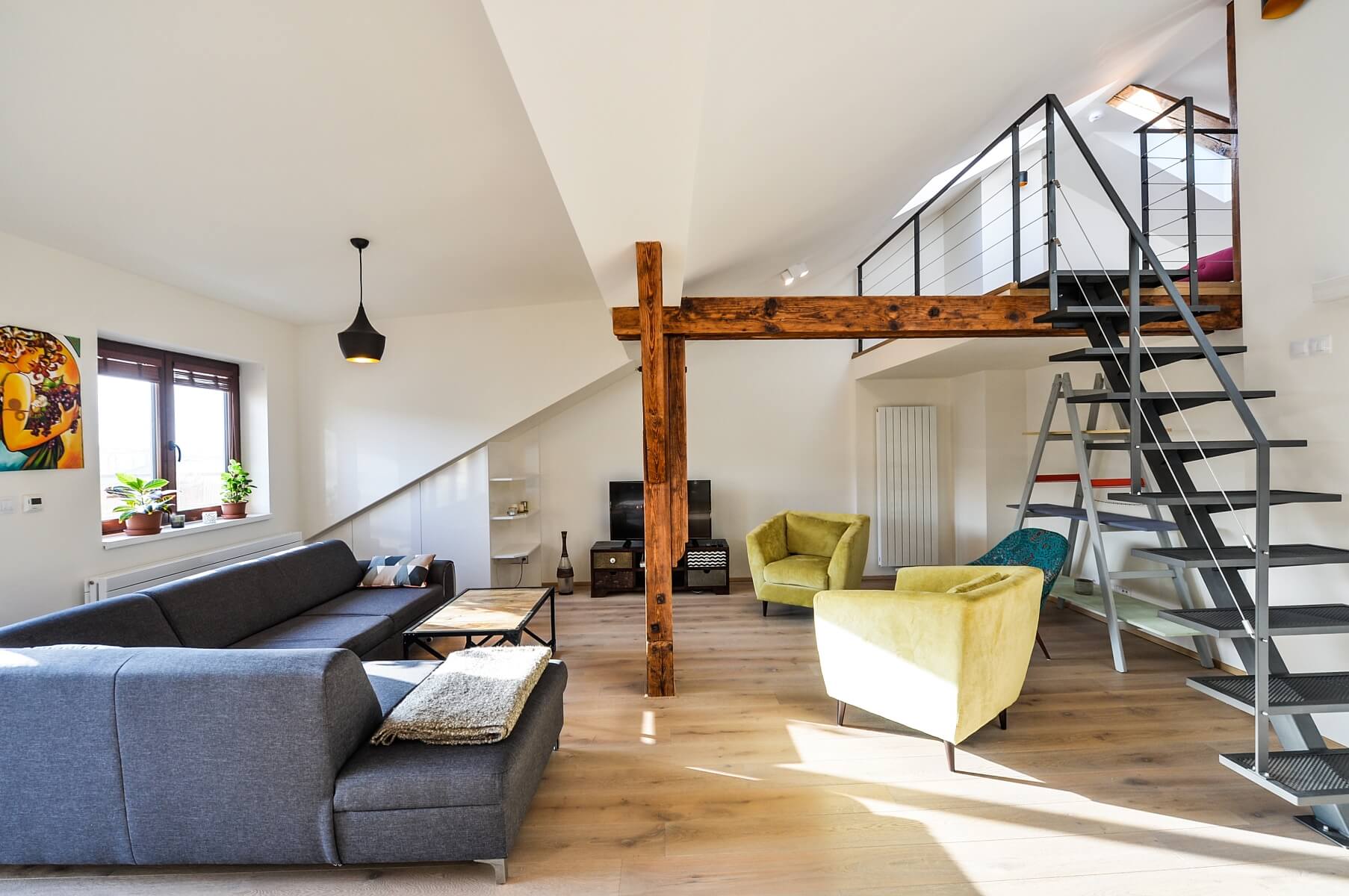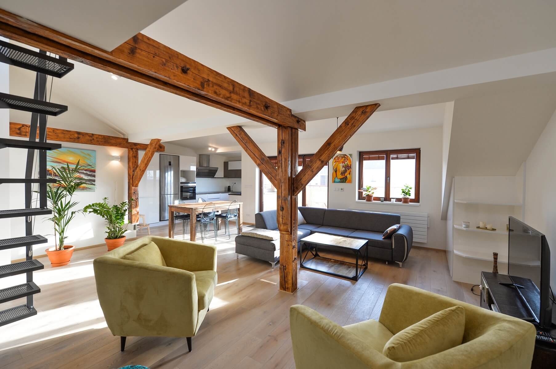 Interiér zútulňují dřevěné podlahy a přiznané masivní trámy. Součástí vybavení jsou bezpečnostní vstupní dveře, podlahové topení v koupelně a na toaletě, vyhřívaná deska z africké žuly u dveří na terasu, vestavěný nábytek a úložné prostory na míru ve všech místnostech. Kuchyňská linka je plně vybavena (včetně indukční varné desky nebo myčky nádobí), okna lze zastínit žaluziemi. Vytápění centrální. K bytu přísluší sklep. Dům je dobře udržovaný a má moderní výtah.