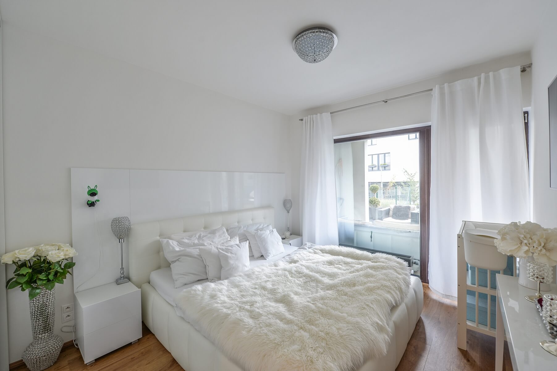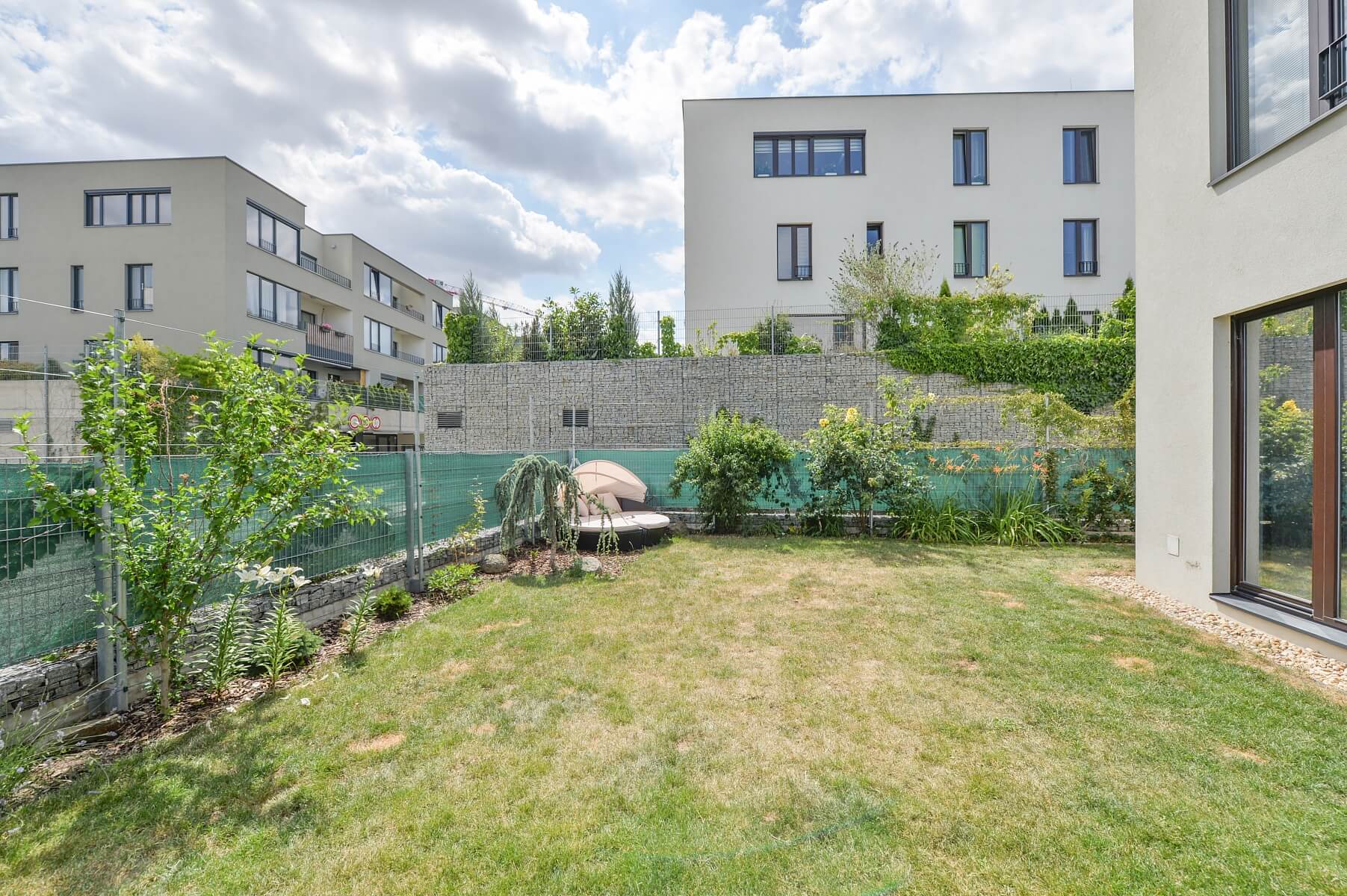Zahradní byt s kompletním vybavením a garážovým stáním je součástí moderní novostavby v rezidenčním komplexu Modřanský háj, který se rozkládá na klidném místě jen pár kroků od přírodního parku.