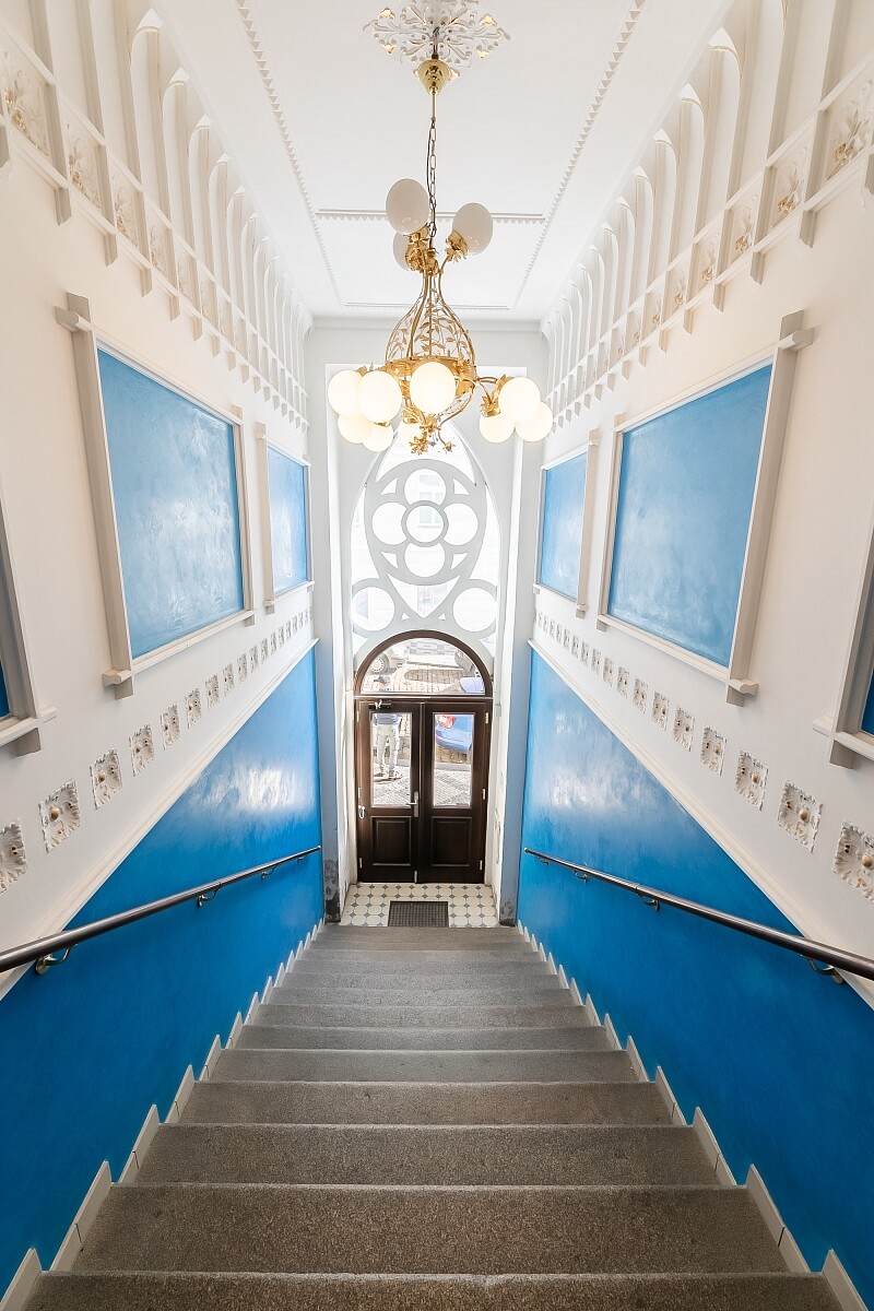 Klimatizovaný mezonetový byt s terasou se nachází v 6. podlaží novogotického rohového domu stojícího v reprezentativní části Vršovic, v místě se snadným dopravním spojením a bohatou nabídkou služeb.