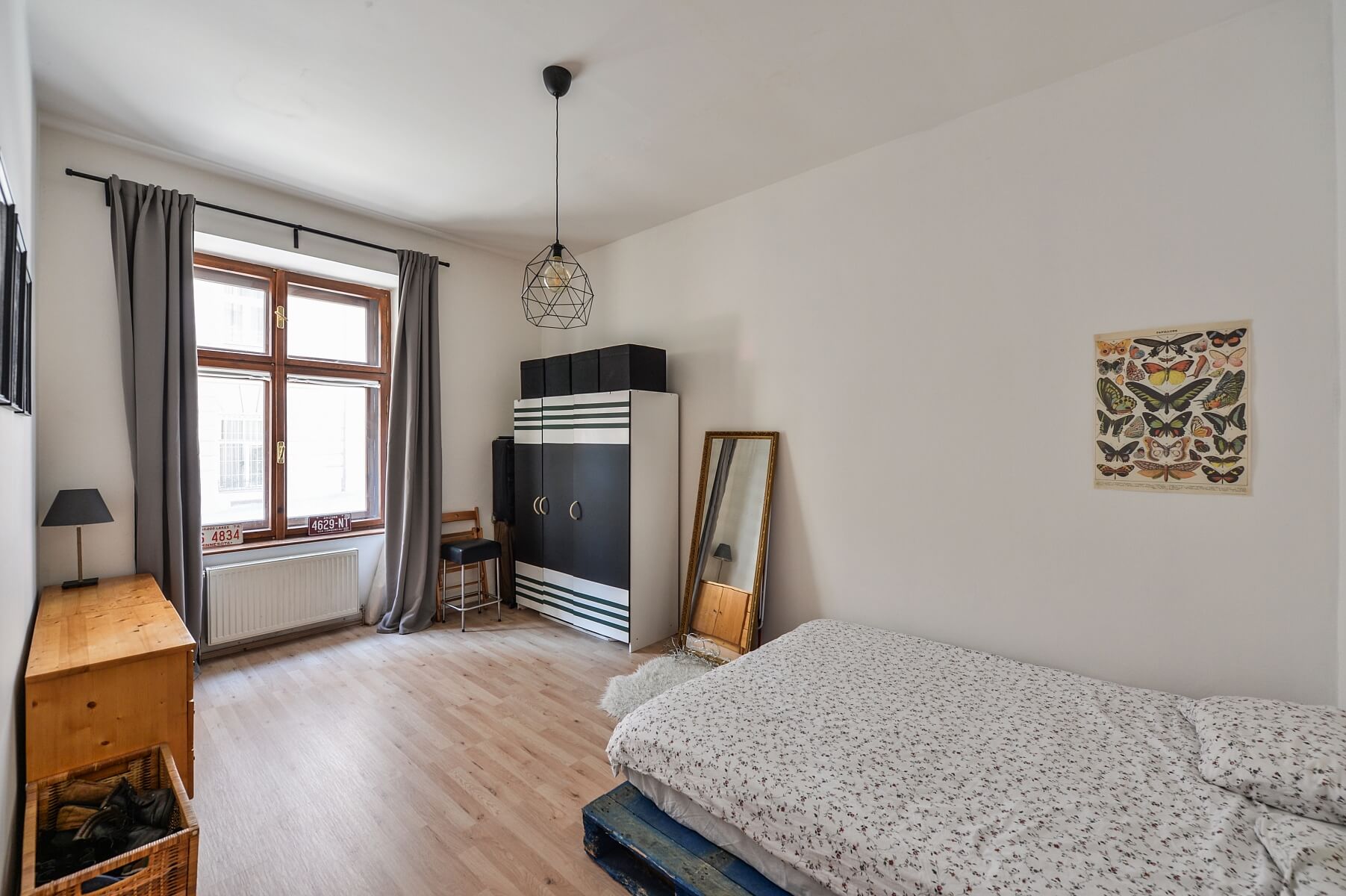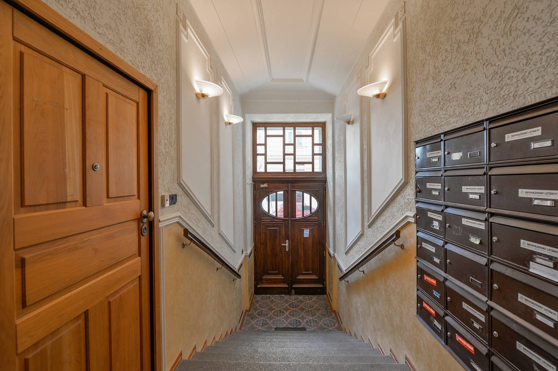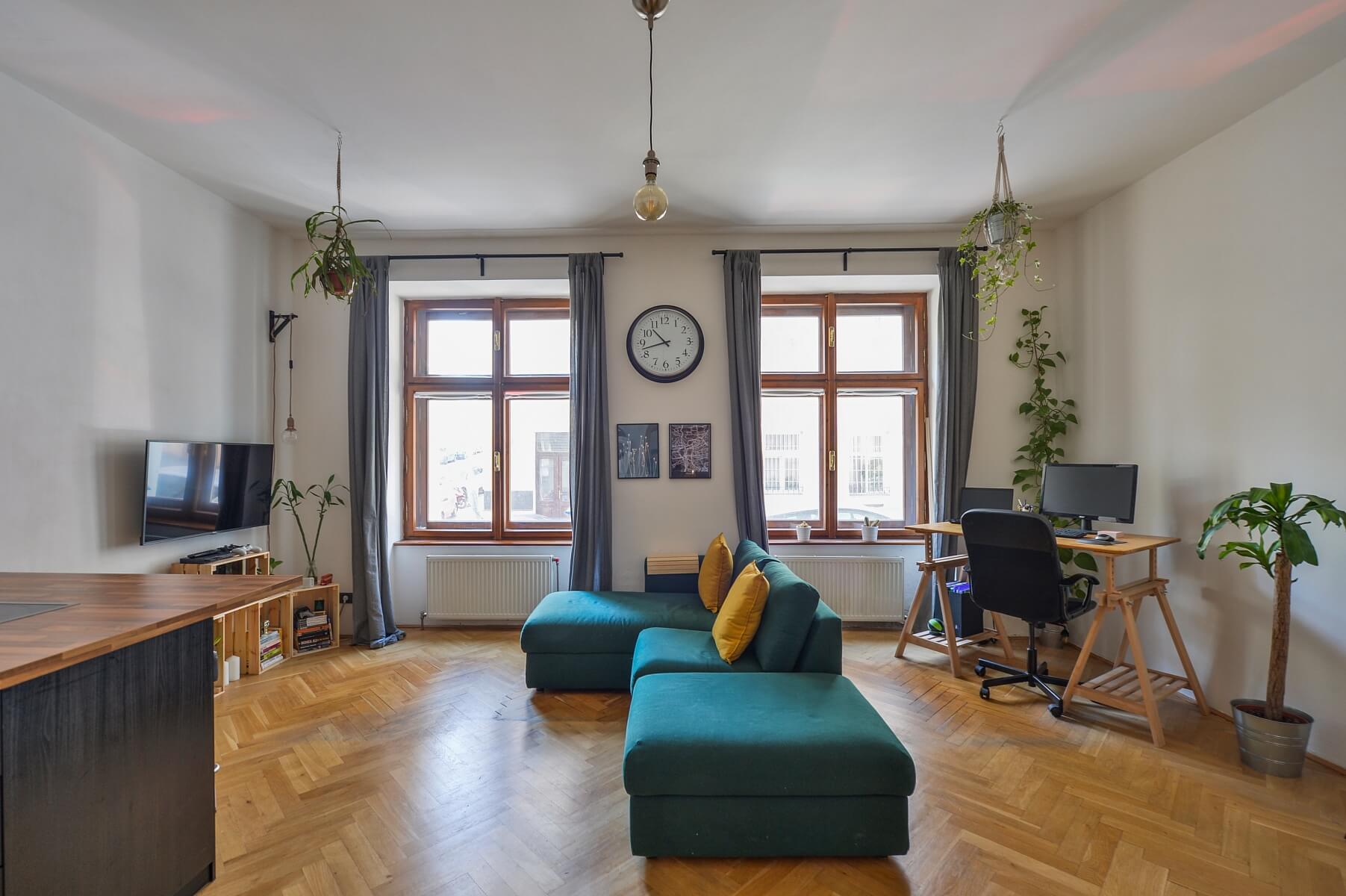 Zrenovovaný byt je umístěn v přízemí rohového činžovního domu v klidné ulici na rozhraní Vinohrad a Vršovic, v těsné blízkosti rozlehlých a pěkně udržovaných Havlíčkových sadů nebo kultovní Krymské ulice.