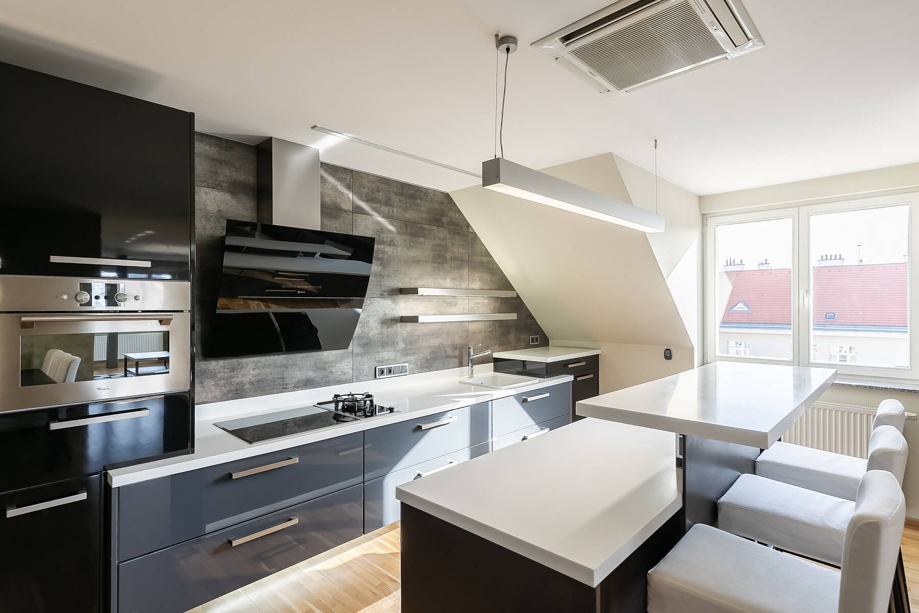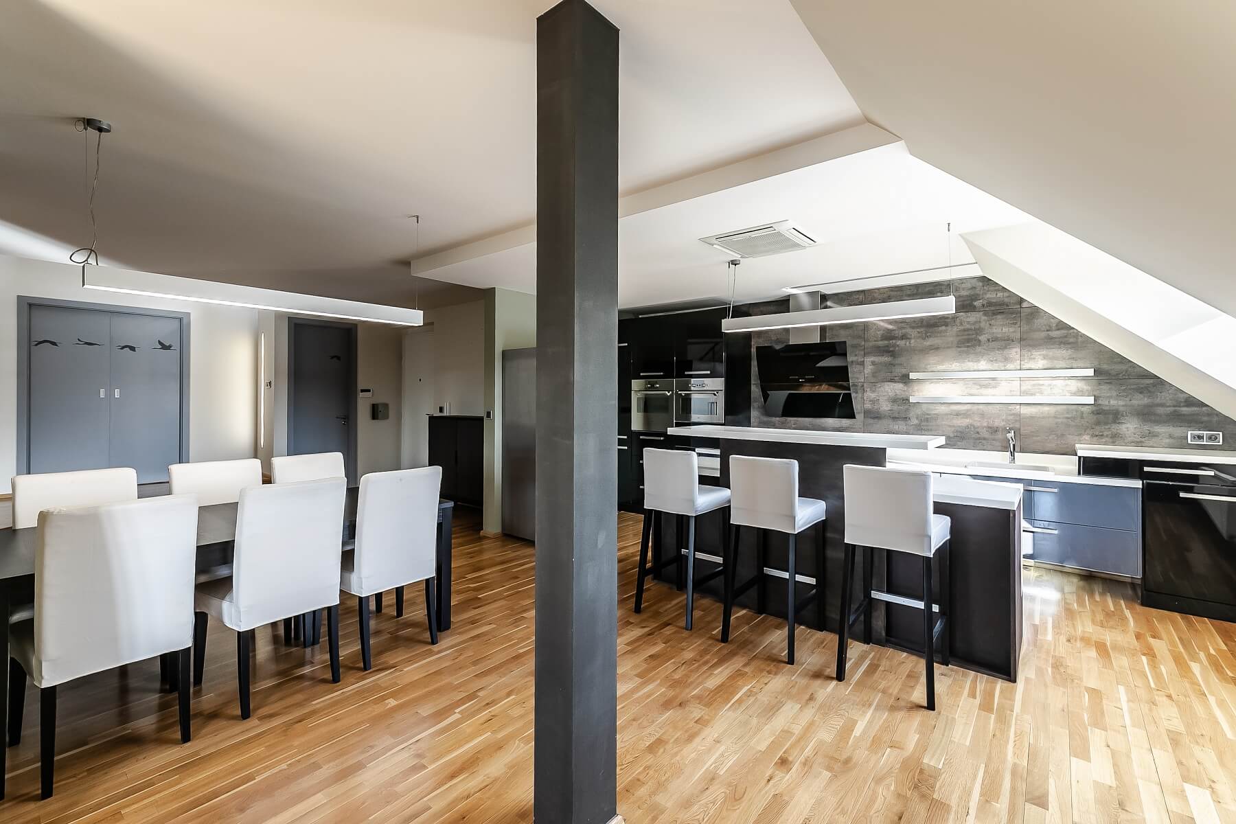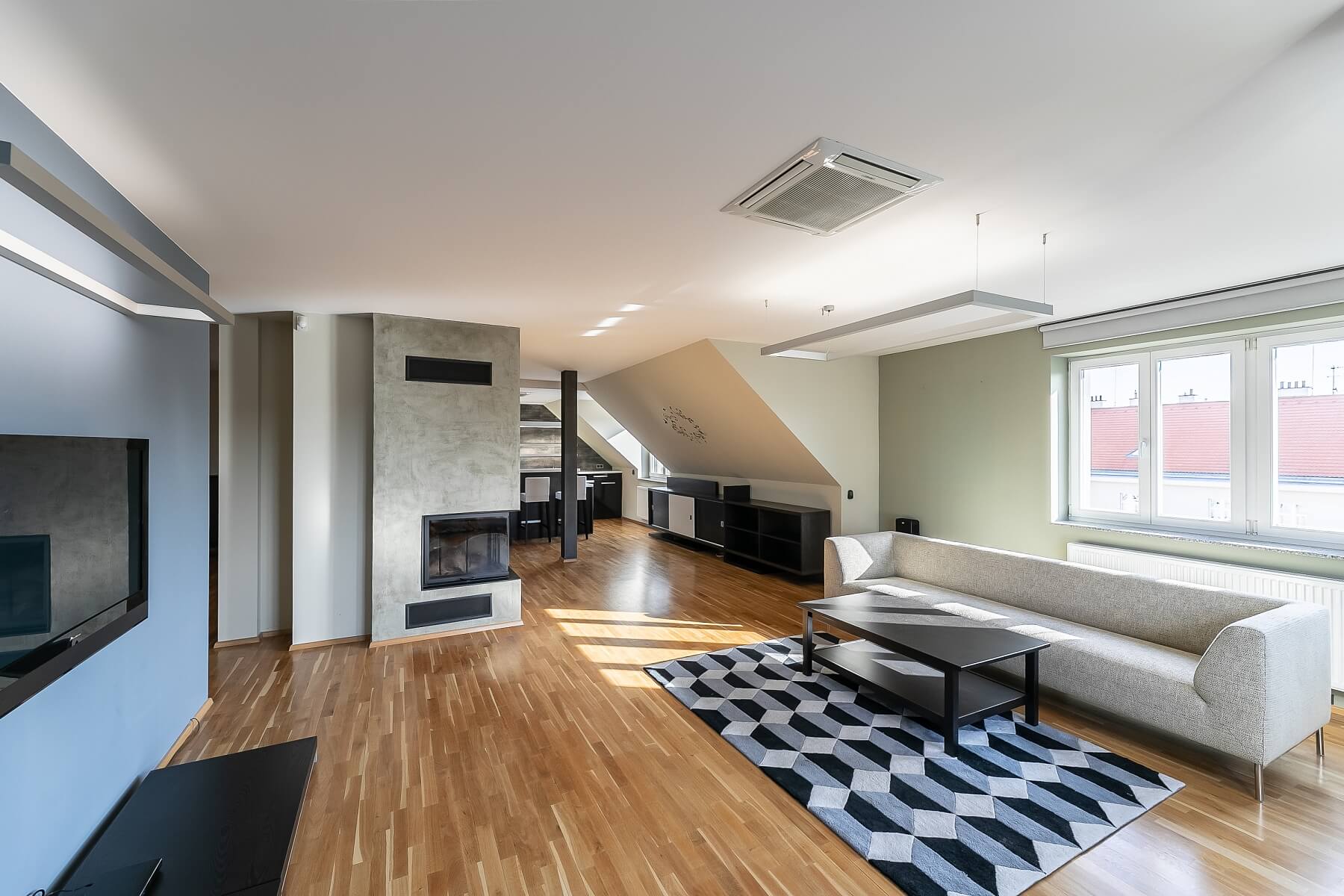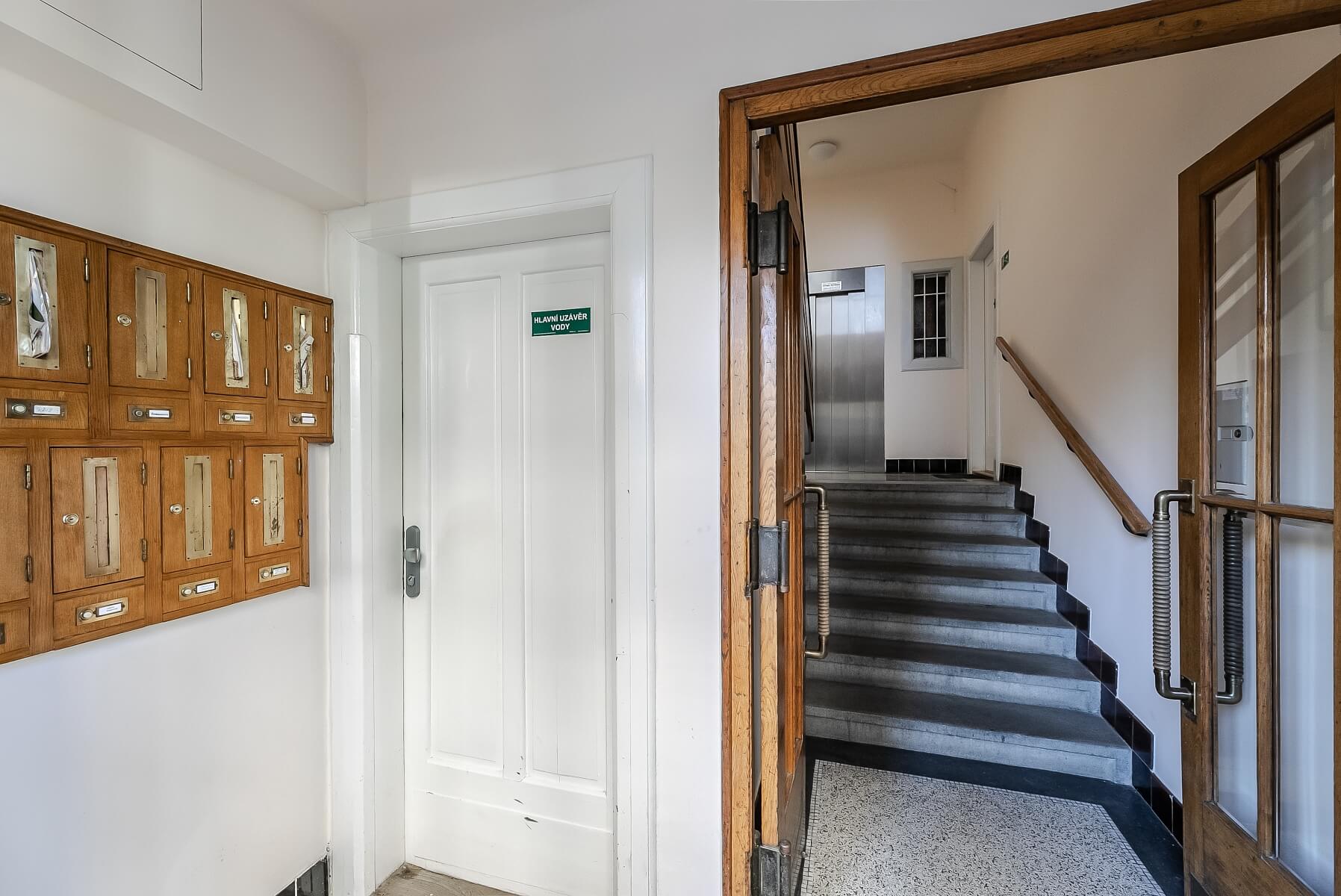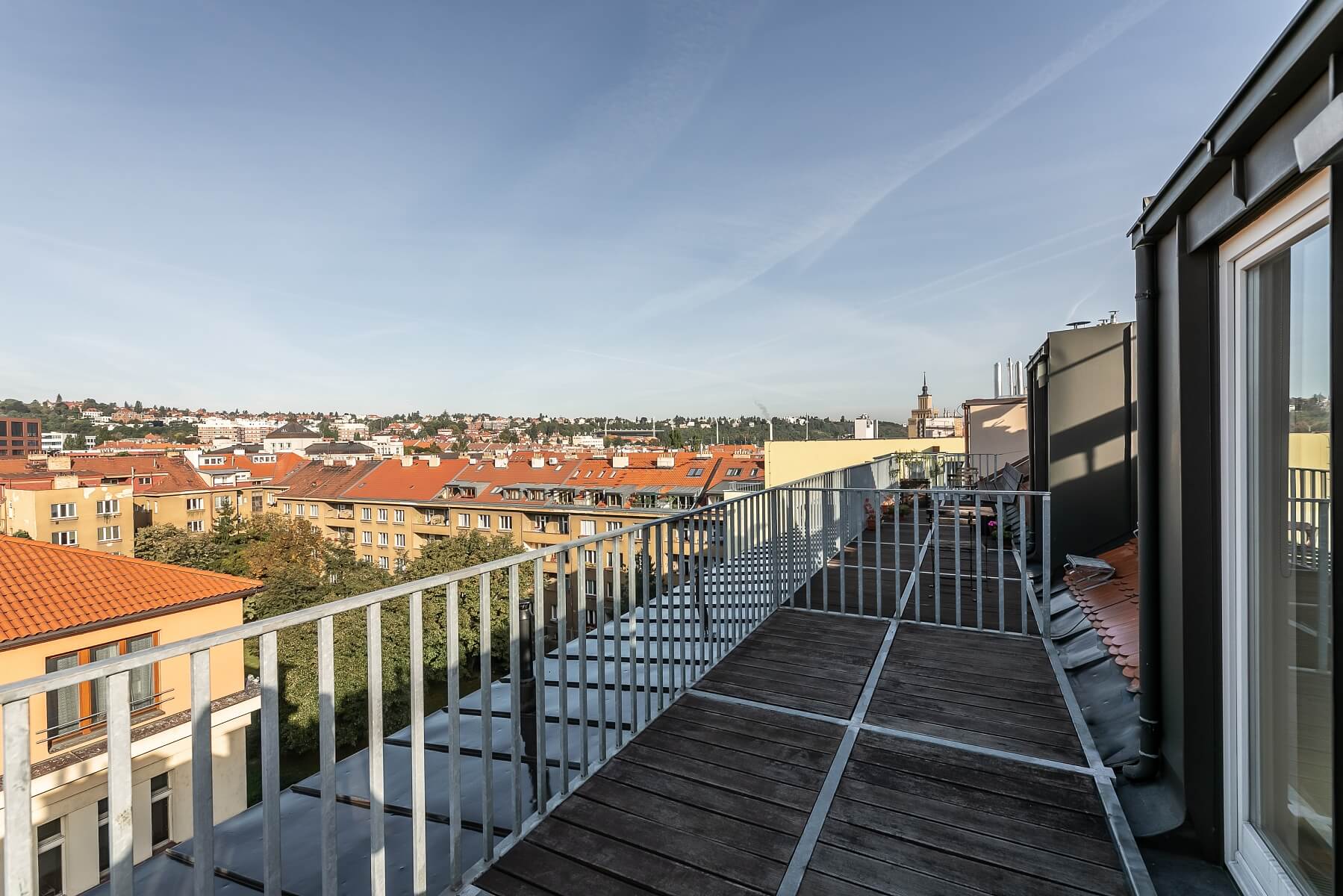 Vzdušný mezonetový byt s klimatizací, terasou a výhledem na Pražský hrad je umístěn v 5. a 6. podlaží klasického bytového domu s výtahem, stojícího v oblíbené čtvrti Dejvice s perfektními službami a dopravním spojením i s množstvím zeleně.
