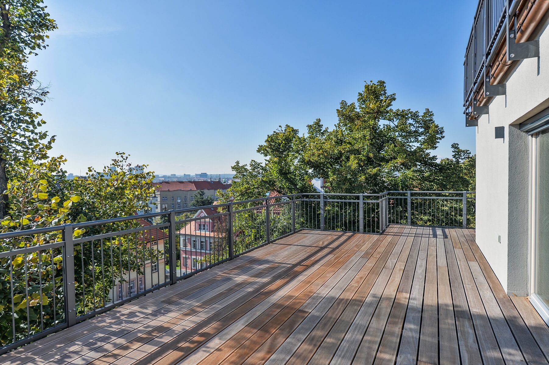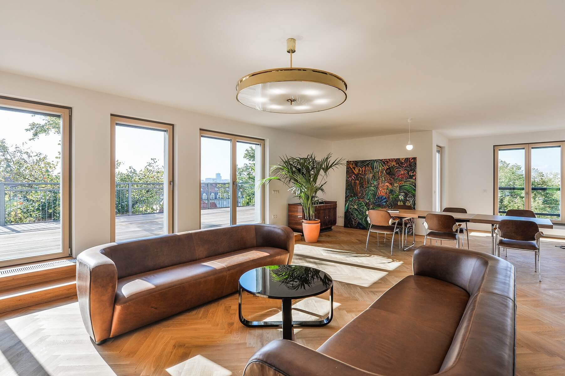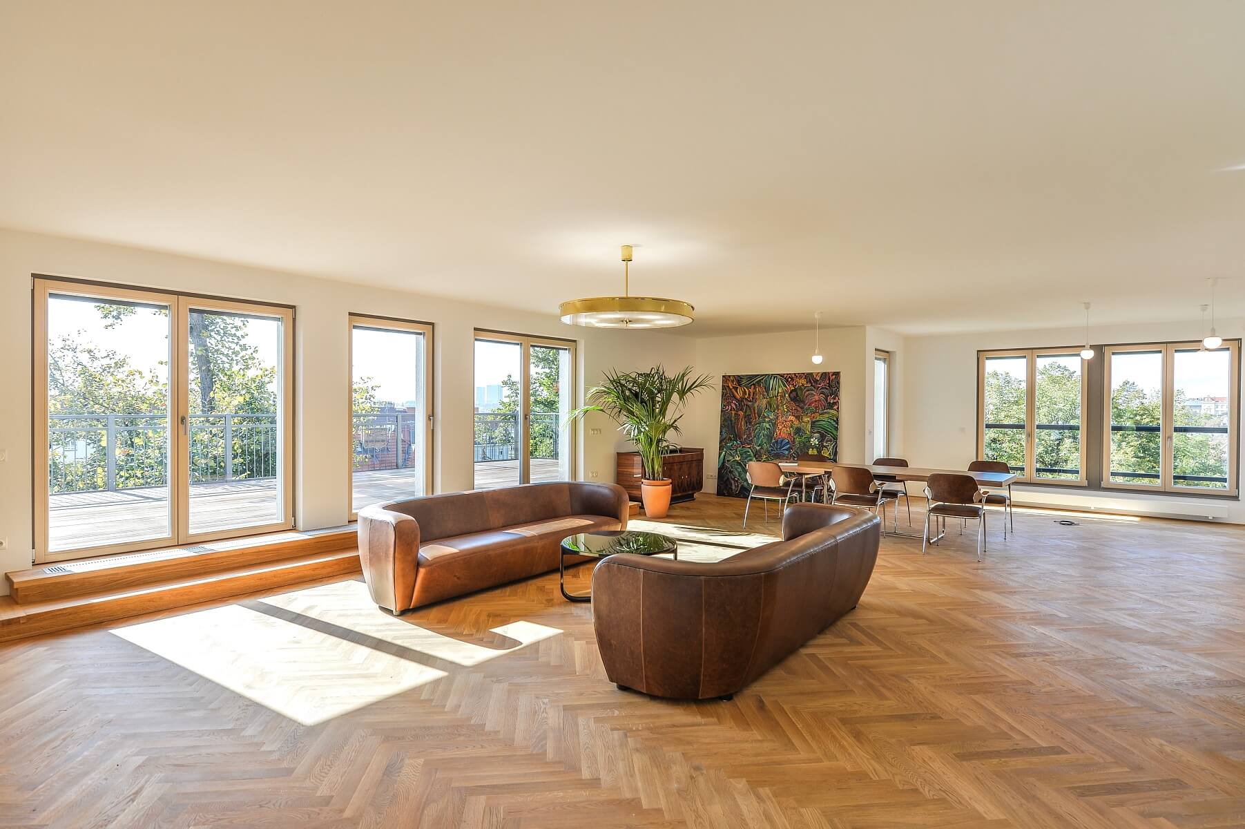 Byt o výměře přes 400 m2 a 66metrovou terasou, umístěný ve 3. podlaží, nabízí orientaci na 3 světové strany. Vskutku velkorysý obývací pokoj s otevřenou kuchyní, jídelnou má vstup na velkou jižní terasu. Dále je zde společenská místnost s kuchyní, 2 ložnice s walk-in šatnami a en-suite koupelnami, další 2 ložnice se šatnami, 2 koupelny, 2 samostatné toalety, vstupní hala, chodba, technická místnost a 2 komory.